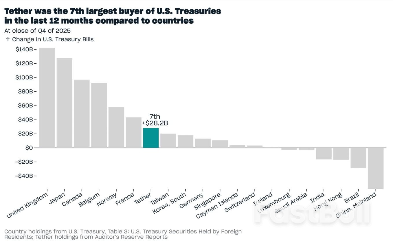 Furthermore, Tether reported total reserves of $192.9 billion at the end of Q4, up $11.7 billion from the previous quarter, leaving net equity of $6.3 billion. Its exposure to US Treasuries increased to $141.6 billion, placing it among the biggest holders globally and ahead of several sovereign nations.