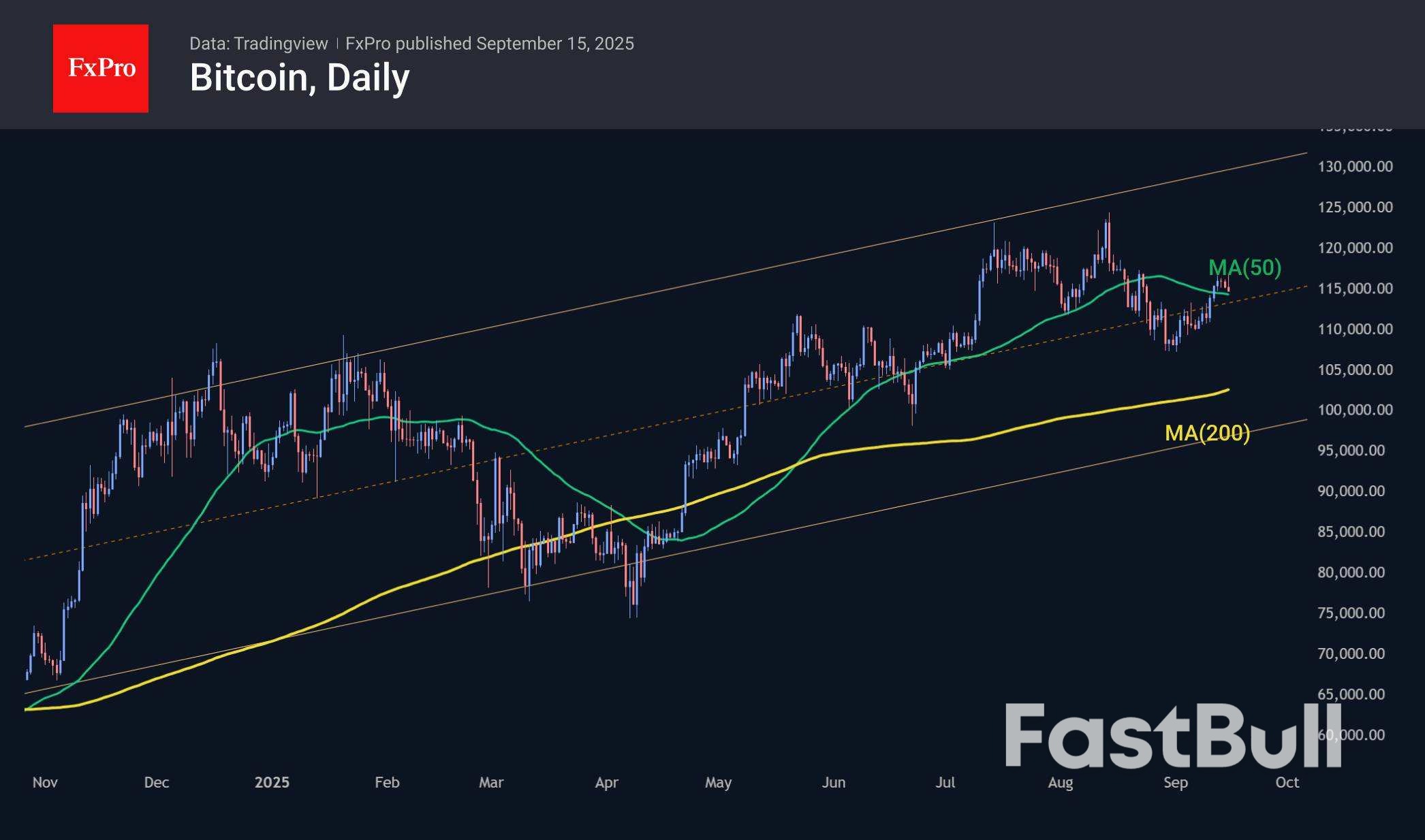 Bitcoin ran into resistance at $116K, but the sell-off is drying up as it approaches $114K, turning the 50-day moving average back into a support line. It seems that Bitcoin has found a temporary balance until the FOMC meeting results are announced. A quarter-point cut is already clearly priced in, but the driver will be the tone of comments regarding the Fed’s future actions. A willingness to further cut rates in the foreseeable future could inspire BTC to march toward new all-time highs.