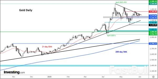 Short-term support is seen between $3,245 and $3,275. This area is shaded in grey on the chart. Below that, we have the bullish trend line coming in at $3200, followed by the previous high that was made in early April at $3,167.