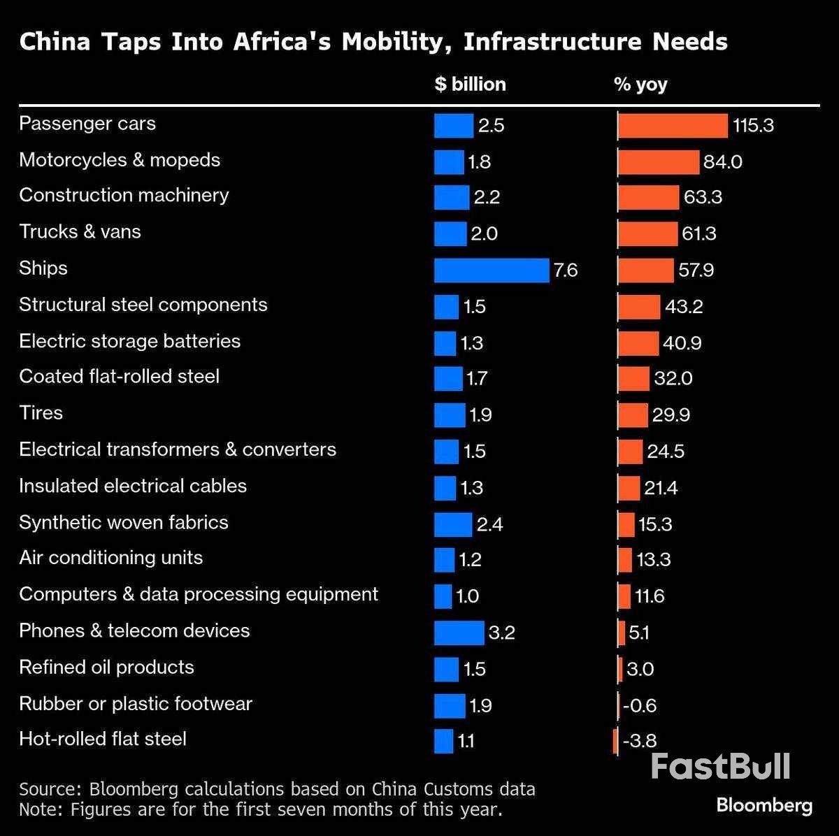 Nigeria, South Africa and Egypt are the biggest African buyers of Chinese products. Construction machinery was among China’s fastest growing exports to Africa in the first seven months, surging 63% year on year.Shipments of passenger cars more than doubled from a year earlier and some steel products expanded in high double digits. At the same time, Africa’s share of China’s total exports remains modest at about 6%, roughly half the level for the US.