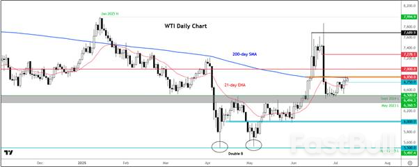 WTI has bounced back from the neckline of the double bottom pattern between $63.60 to $65.00 area (shaded in grey on the chart). This area remains crucial for long-term support, given that the lows of May 2023 and September 2024 were previously formed here, and now we are above it. Should WTI break back below this zone, the technical outlook would turn negative once again, which could encourage fresh selling below that zone.
