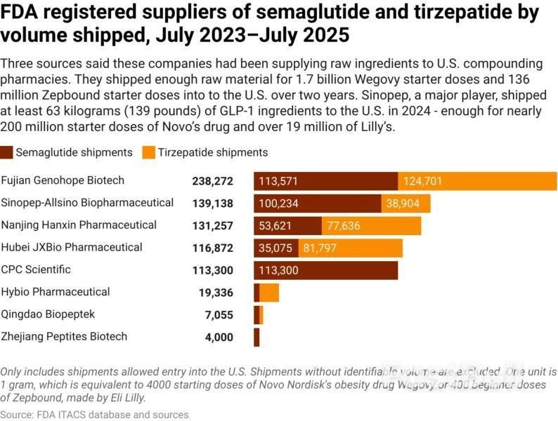 Compounding of the in-demand weight-loss medicines while the branded drugs were in short supply represented an unprecedented opportunity.In 2024 alone, the eight Chinese companies shipped enough raw material into the U.S. to produce more than 1 billion starter doses of the blockbuster medicines, according to FDA shipping data.Novo's estimate is even higher. It said Chinese companies shipped enough semaglutide into the U.S. in just over six months to make 1.5 billion starter doses of Wegovy, according to a letter submitted to the U.S. Department of Commerce and posted publicly.