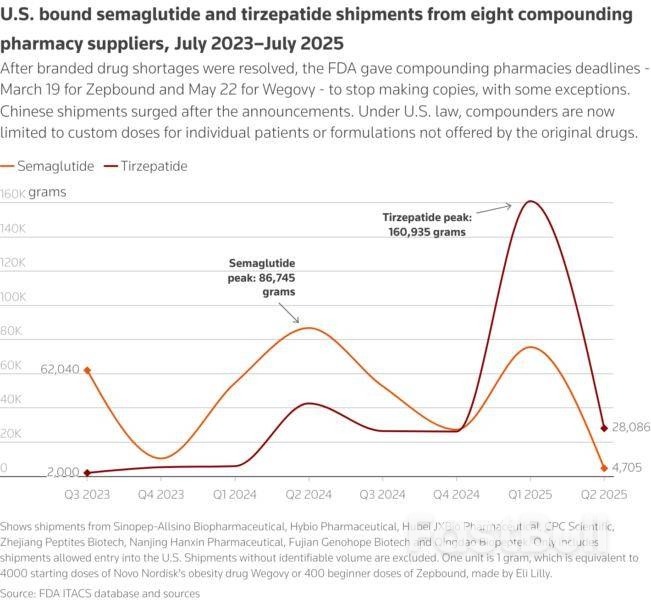 In this year's first quarter, with company supply shortages no longer an issue and the FDA pressing for an end to mass compounding, Hybio, Sinopep and others were still bringing in sizable shipments of ingredients to copy both drugs.By the second quarter, shipments had plunged 90% from a year earlier for semaglutide, also the main ingredient in Novo's diabetes treatment Ozempic, and by 34% for tirzepatide used to make Zepbound and Mounjaro copies.