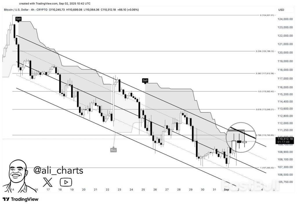 Charts from the BTC/USDT 4-hour timeframe show the asset moving within a downward channel that started forming in mid-August. Repeated rejections at the top of this channel are raising concerns about a possible move back to lower levels. Market watcher Ali pointed out that the resistance near $110,700 has been tested several times but never broken. He stated, “Multiple wicks at this level signal rejection,” suggesting the price may revisit the $107,200 or even the $103,000 range if pressure builds.