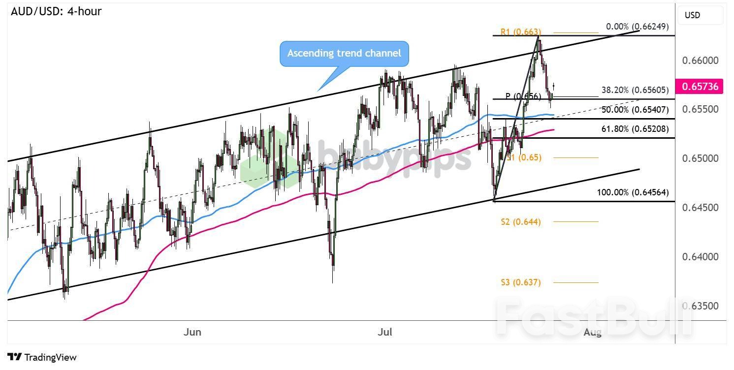 Support could also be found at the 61.8% level then S1 (.6500) that coincides with a major psychological mark, so look out for reversal candlesticks that could suggest the uptrend is ready to resume. If this happens, bulls could set sights back on upside targets at the channel top or higher.