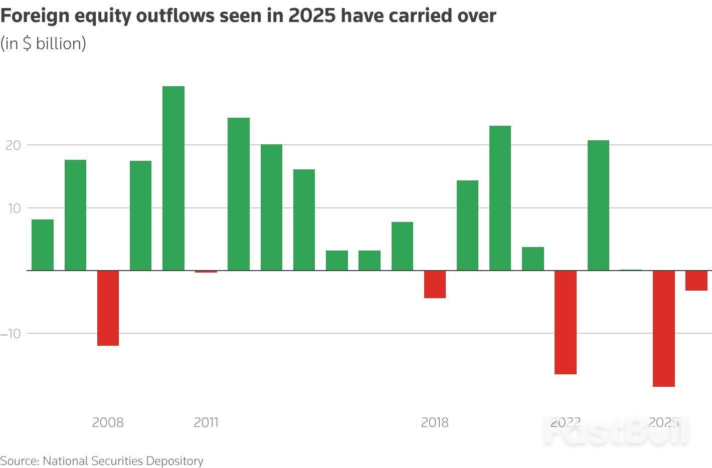 Foreign investors have already pulled around $3 billion from Indian shares in January, following record outflows of nearly $19 billion in 2025. This trend has put pressure on the domestic stock market, which fell 0.3% on Wednesday after its largest drop in over eight months the day before.