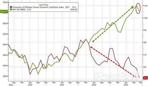 The weakness from the preliminary UMich data for November has been confirmed with the final sentiment print confirmed the so-called 'K-shaped' economy as sentiment slumps with stocks near record highs.