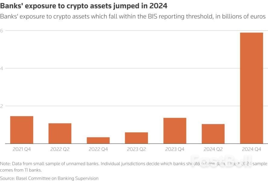 Basel Committee on Banking Supervision data shows 5.9 billion euros worth of prudential exposure to crypto in the second half of 2024, among banks from countries which volunteered data.