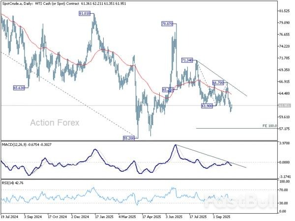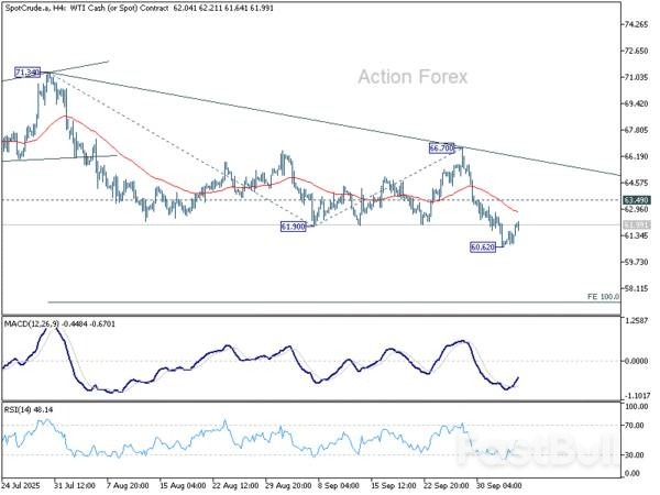 Technically, for WTI oil, some consolidations would be seen above 60.62 temporary low for the near term. But risk will stay on the downside as long as 63.49 minor resistance holds.