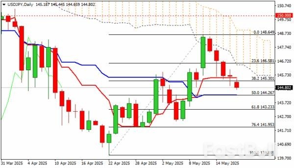 Bears eye pivotal support at 144.26 (50% retracement of 139.88/148.64 recovery leg, reinforced by daily Kijun-sen and bull-trendline off 139.88), loss of which would further weaken near-term structure and risk deeper drop.