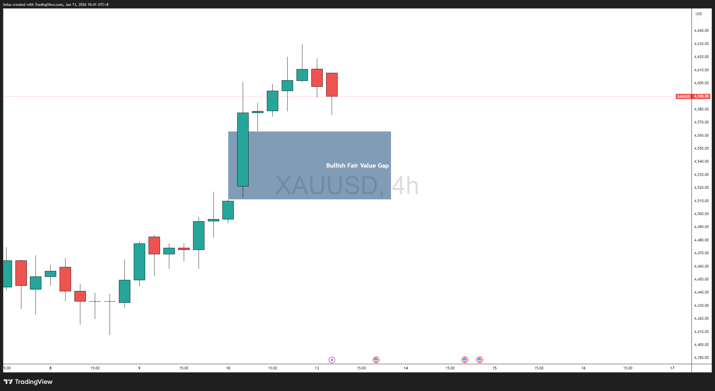 On the 4-hour chart, gold left behind a clear bullish Fair Value Gap following an aggressive displacement to the upside. Price is currently trading above this imbalance, signaling that buyers remain in control of short-term structure.