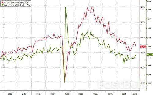 While the job openings data was a beat and a rebound, there was more good news on the hiring side where the number of new hires also rose to 5.573 million from 5.404 million, the highest since last May, and hardly screaming collapse in the labor market. Meanwhile, the number of workers quitting their jobs - a sign of confidence in finding a better paying job elsewhere - dropped modestly after rising the previous month, and in April it dipped to 3.194 million, down from 3.344 million, perhaps the only blemish in today's JOLTS report.