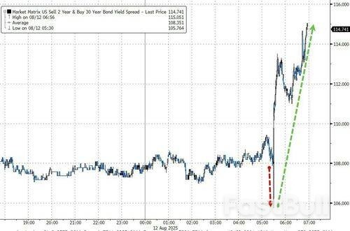 The yield curve is steepening, with 10-year yields spiking from the CPI aftermath (where focus has turned to the red hot Supercore inflation print) and hitting session highs after Trump took to Truth Social to slam Jerome Powell again, just two weeks after the two of them appeared to have patched things up.