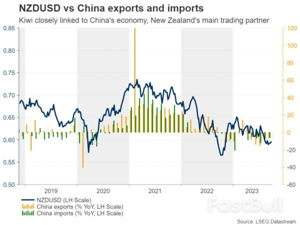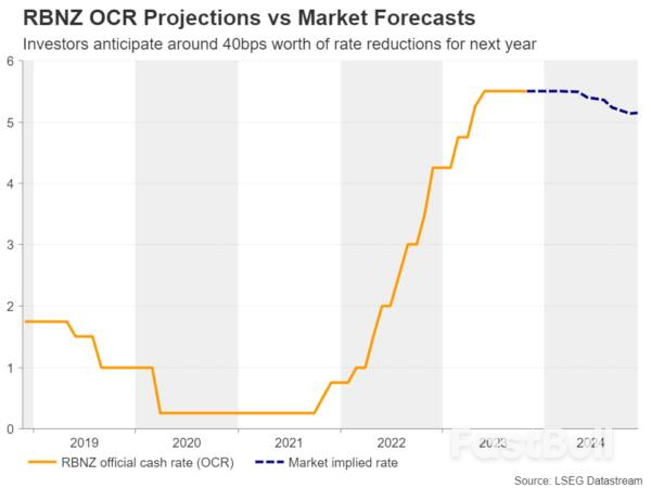 Having all these variables in mind, even if officials lower their short-term inflation projections based on the latest data releases, the longer-term outlook is unlikely to be changed much, and they will most likely continue to suggest that interest rates will finish 2024 at the current 5.5% level. Compared to the market’s own implied path, this could be interpreted as a relatively hawkish hold and could prove positive for the New Zealand dollar, which has been outperforming its US counterpart lately on speculation that the Fed may need to cut interest rates by around 90bps next year.