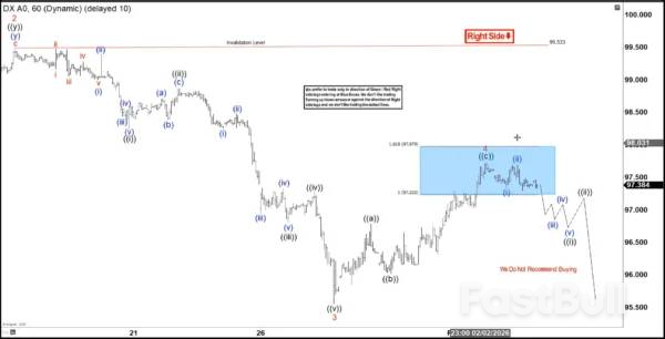The Dollar Index (DXY) continues to unfold from the September 2022 peak as a five‑wave cycle, with the structure now approaching the conclusion of wave ((5)). Wave ((4)) of this impulse move ended at 100.395 on November 21, 2025, after which the Dollar resumed its decline. The Index currently displays only a clear three‑swing sequence down from the November 21 high, which strongly suggests that the downside remains incomplete. From wave ((4)), wave 1 terminated at 97.75, while wave 2 retraced higher to 99.53, as reflected in the one‑hour chart. The Index then resumed lower in wave 3.