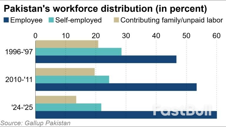 In addition to the PBF's analysis, Gallup Pakistan released one covering household income and expenditure last month. It shows that salaried employees now account for 60.1% of the workforce, up from 53.4% in fiscal 2010-2011, while self-employment has remained low at 21.8%, down from 24.4% in 2010-2011.