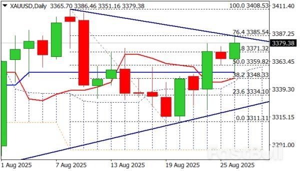 Fresh strength cracked important barrier at $3385 (upper triangle boundary / Fibo 76.4% of $3408/$331 bear-leg) but was so far unable to break higher.