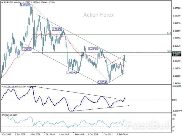 EUR/USD is currently trading around 1.18, still below the informal ECB red line. For now, the pair still has room to run, but traders may begin to tread more carefully as it approaches the 1.2 zone. Technically, that also coincides with a long term fibonacci level, 38.2% retracement of 1.6039 (2008 high) to 0.9534 (2022 low) at 1.2019. EUR/USD’s reaction to this level is crucial in determining whether it’s just in a medium term corrective pattern from 0.9534. Or it’s actually reversing the down trend that lasted more than a decade and a half.