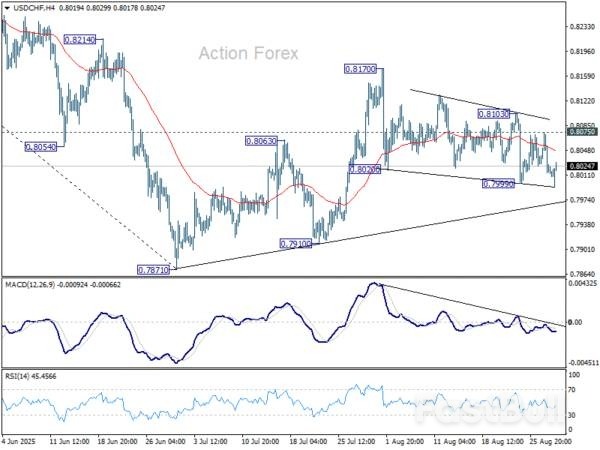 В целом, долгосрочный нисходящий тренд от 1,0342 (максимум 2017 года) всё ещё продолжается. Следующая цель — 100%-ная проекция от 1,0146 (максимум 2022 года) до 0,8332 с 0,9200 на уровне 0,7382. В любом случае, прогноз останется медвежьим, пока держится сопротивление 0,8475.