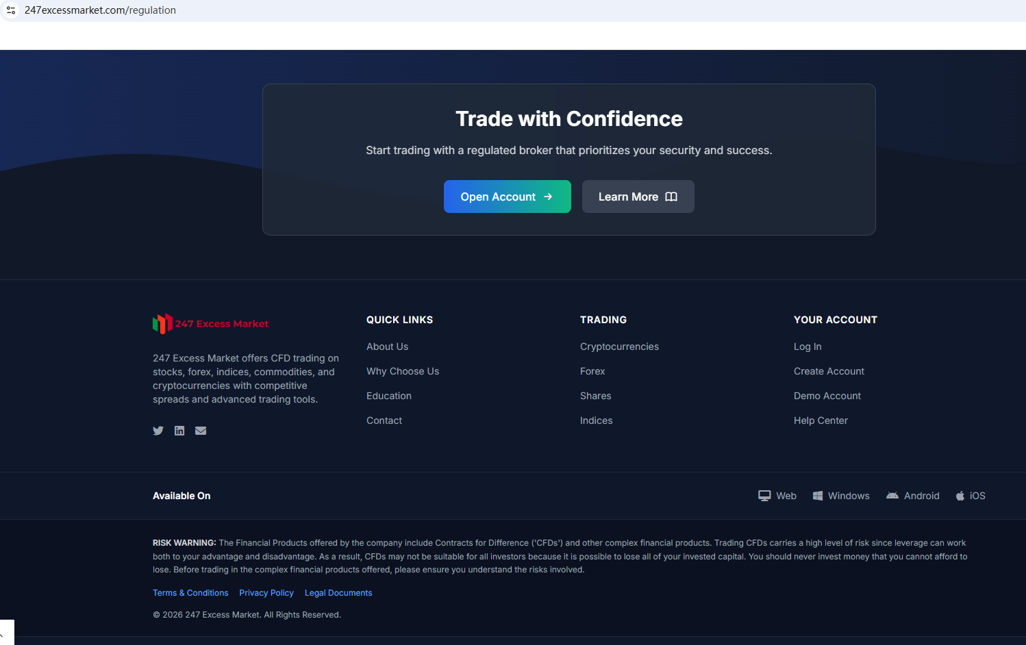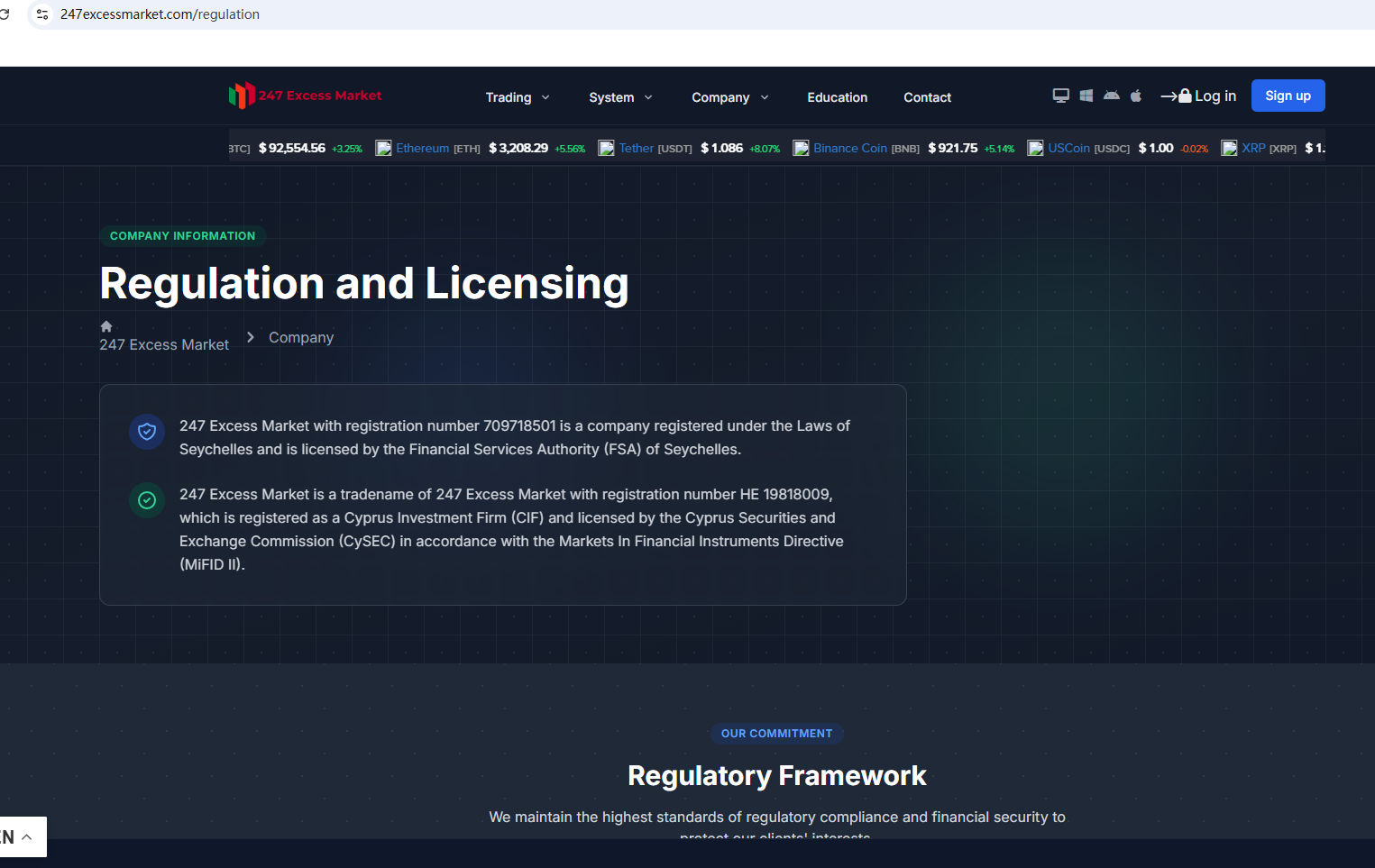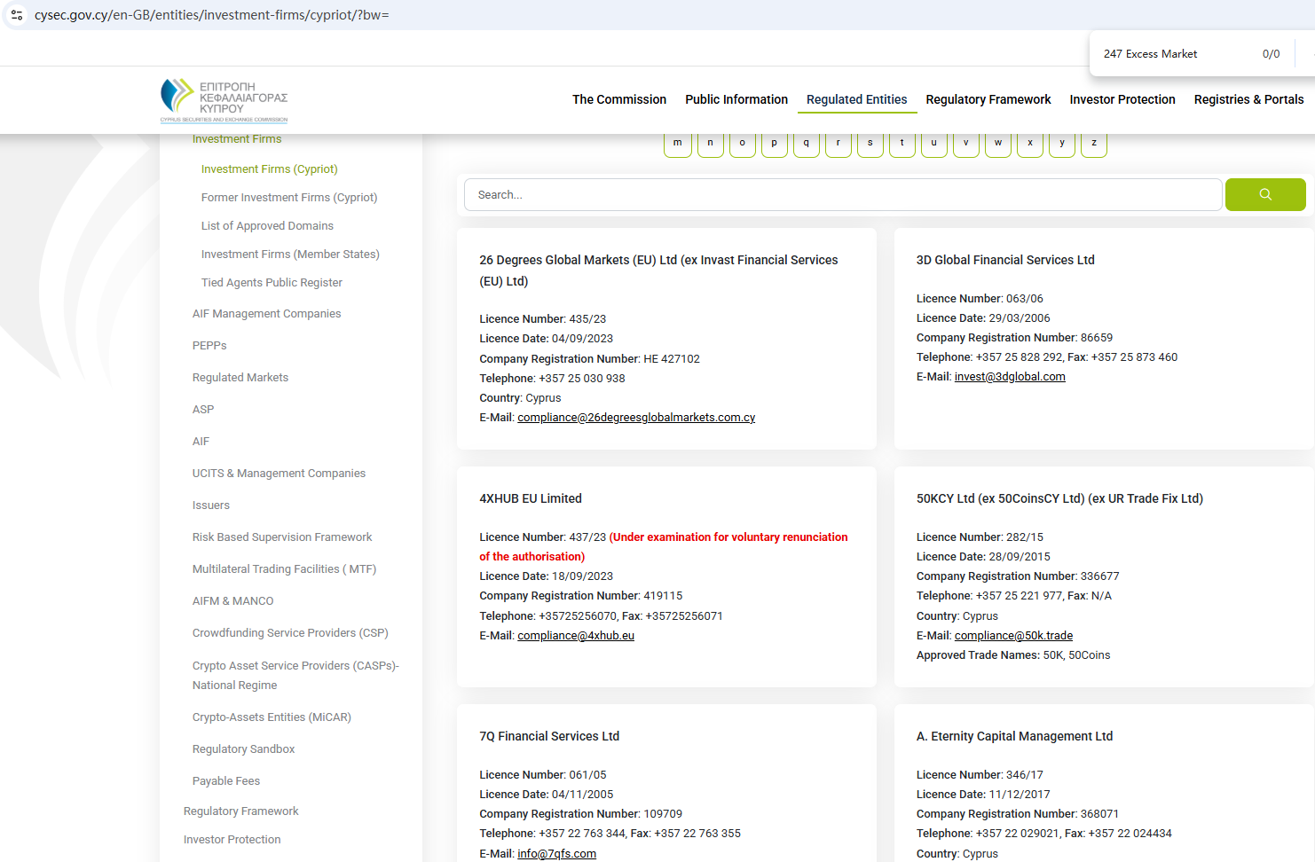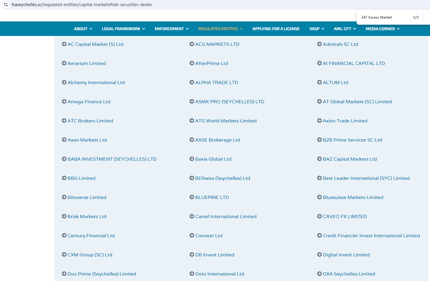 ตามข้อมูลบนเว็บไซต์ บริษัทอ้างว่าได้รับการกำกับดูแลโดยหน่วยงานกำกับดูแลบริการทางการเงินของเซเชลส์ (Seychelles FSA) และคณะกรรมการกำกับหลักทรัพย์และตลาดหลักทรัพย์ของไซปรัส (CySEC) อย่างไรก็ตาม จากการตรวจสอบไม่พบข้อมูลที่ตรงกันใน Seychelles FSA และ CySEC นอกจากนี้ หน่วยงานกำกับดูแลด้านการเงิน (FCA) ยังได้ออกคำเตือนเกี่ยวกับ 247 Excess Market โดยสงสัยว่าบริษัทนี้อาจให้บริการหรือผลิตภัณฑ์ทางการเงินโดยไม่ได้รับอนุญาตอย่างถูกต้อง