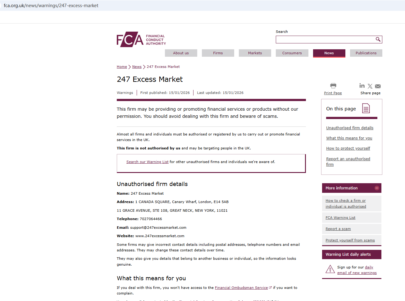 เมื่อวันที่ 15 มกราคม 2569 หน่วยงานกำกับดูแลด้านการเงิน (FCA) ได้ออกคำเตือนเกี่ยวกับบริษัท 247 Excess Market โดยสงสัยว่าบริษัทนี้อาจให้บริการหรือผลิตภัณฑ์ทางการเงินโดยไม่ได้รับอนุญาตอย่างถูกต้องhttps://www.fca.org.uk/news/warnings/247-excess-market