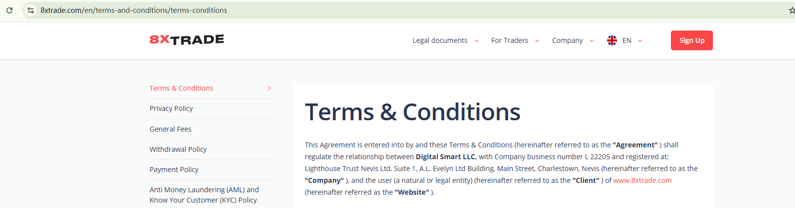8xTrade is a fraudulent broker. It does not display any legitimate regulatory information and merely claims that its operating company, Digital Smart LLC, is registered in Saint Vincent and the Grenadines. However, a search in the official registry of the Financial Services Authority (FSA) of Saint Vincent and the Grenadines shows that the company’s registration status is listed as “Discontinued.” Moreover, even if active, such a registration would not constitute a license to provide forex or investment services, as the FSA in Saint Vincent and the Grenadines does not issue regulatory authorizations for trading activities.