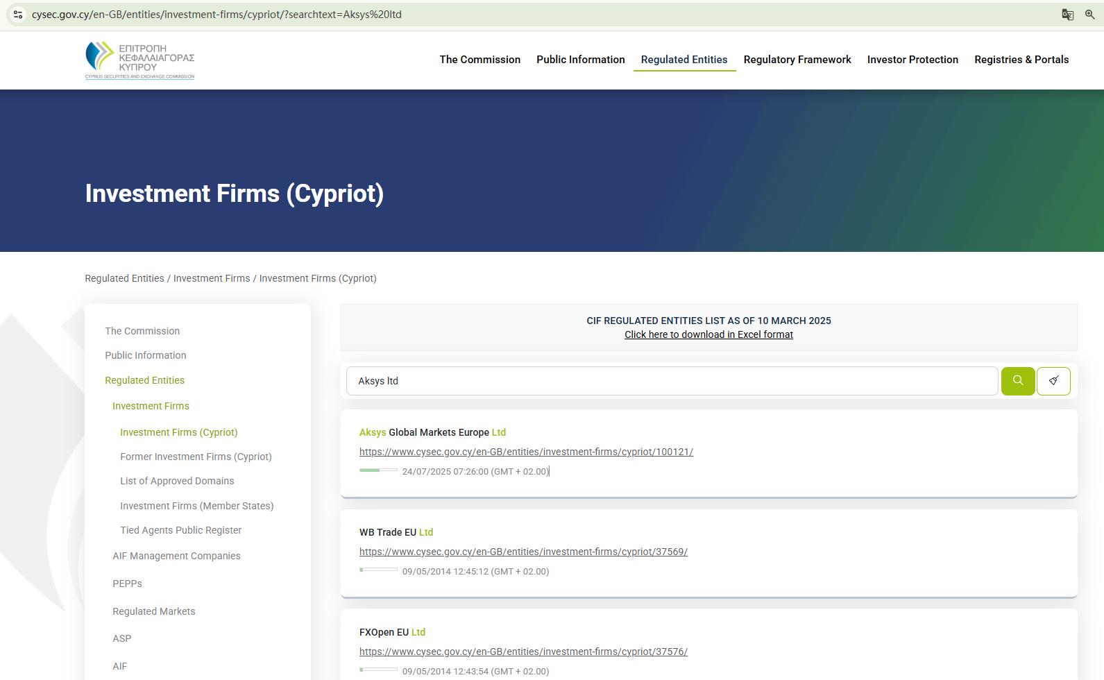 เราได้ค้นหาในทะเบียนอย่างเป็นทางการของสำนักงานคณะกรรมการกำกับหลักทรัพย์และตลาดหลักทรัพย์ไซปรัส (CySEC) โดยใช้รายละเอียดทั้งหมดที่มีอยู่ แต่ไม่พบบริษัทใดที่ตรงกับบริษัท Aksys ltd. อย่างแน่นอน