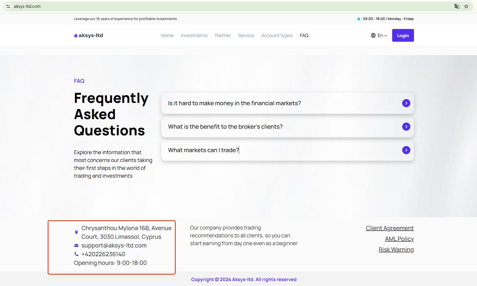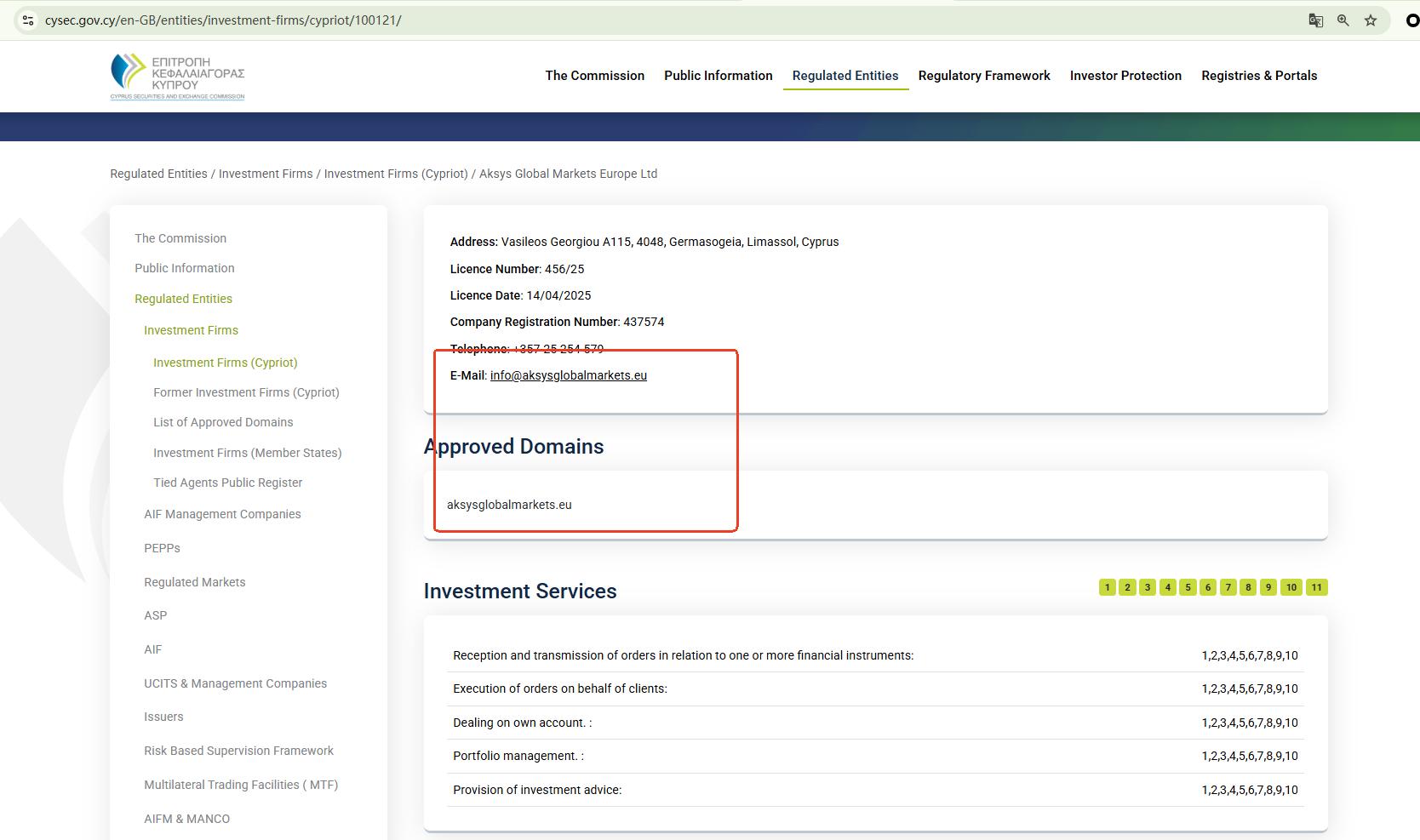 เว็บไซต์ของ Aksys ltd ไม่มีการเปิดเผยข้อมูลด้านกฎระเบียบใดๆ มีเพียงการอ้างว่าบริษัทจดทะเบียนในประเทศไซปรัสเท่านั้น เราได้ค้นหาในทะเบียนอย่างเป็นทางการของสำนักงานคณะกรรมการกำกับหลักทรัพย์และตลาดหลักทรัพย์ไซปรัส (CySEC) โดยใช้รายละเอียดทั้งหมดที่มีอยู่ แต่ไม่พบบริษัทใดที่ตรงกับบริษัท Aksys ltd. อย่างแน่นอนการขาดข้อมูลพื้นฐานเกี่ยวกับบริษัทและข้อกำหนดทางกฎหมายอย่างชัดเจน บ่งชี้ว่าบริษัท Aksys ltd ดำเนินการโดยไม่ได้รับอนุญาต ดังนั้น บริษัท Aksys ltd จึงดูเหมือนจะเป็นการหลอกลวง