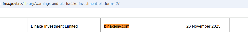 เมื่อวันที่ 26 พฤศจิกายน 2025 สำนักงานตลาดการเงินนิวซีแลนด์ (NZ FMA) ได้เพิ่ม Binaxe Investment Limited ลงในรายชื่อคำเตือน โดยระบุว่านี่เป็นแพลตฟอร์มการลงทุนปลอมhttps://www.fma.govt.nz/library/warnings-and-alerts/fake-investment-platforms-2/