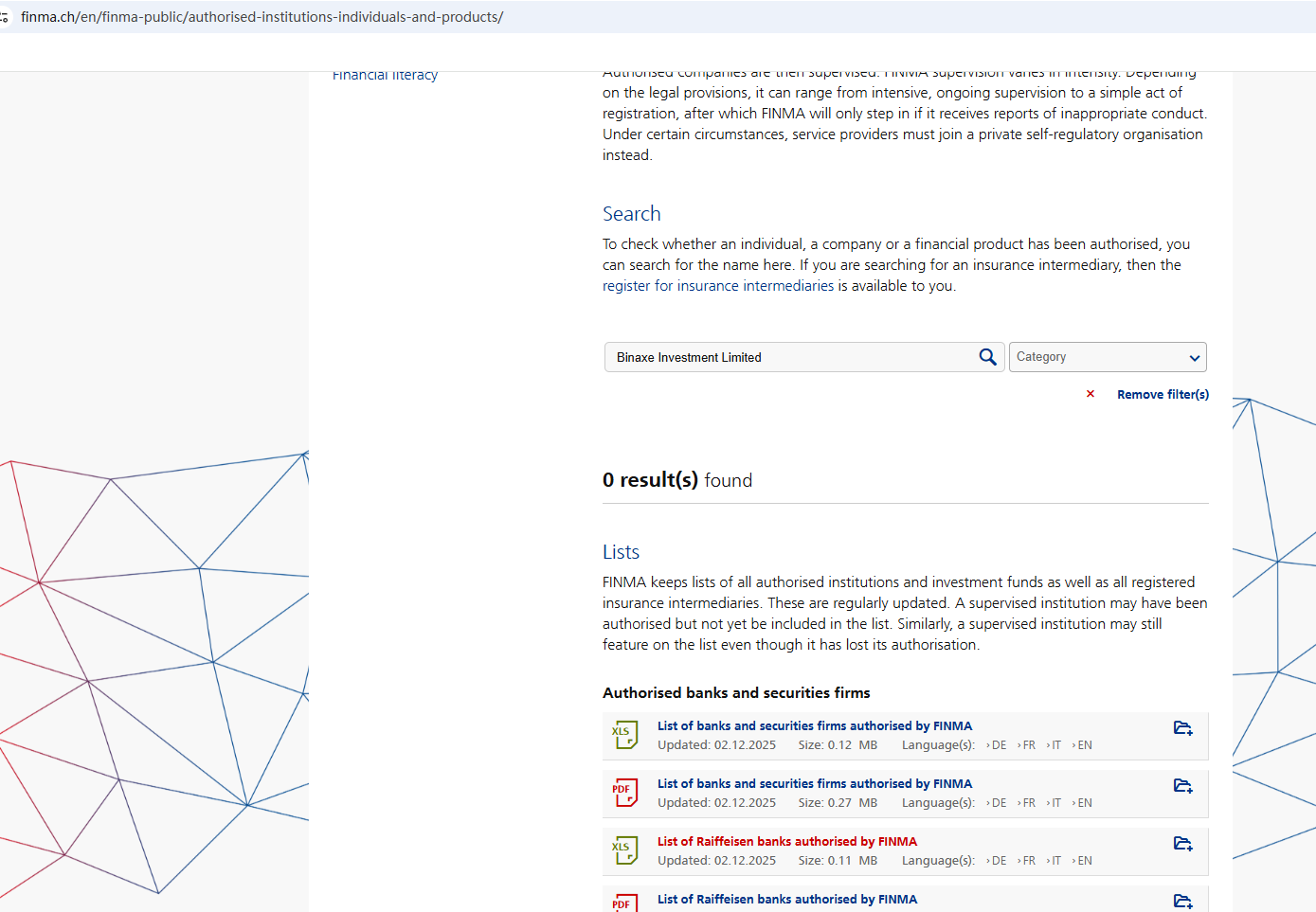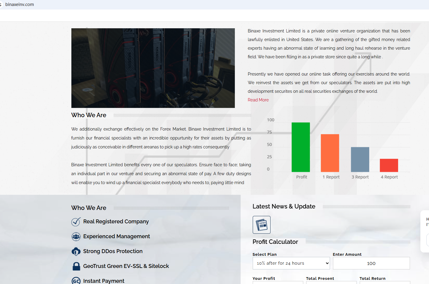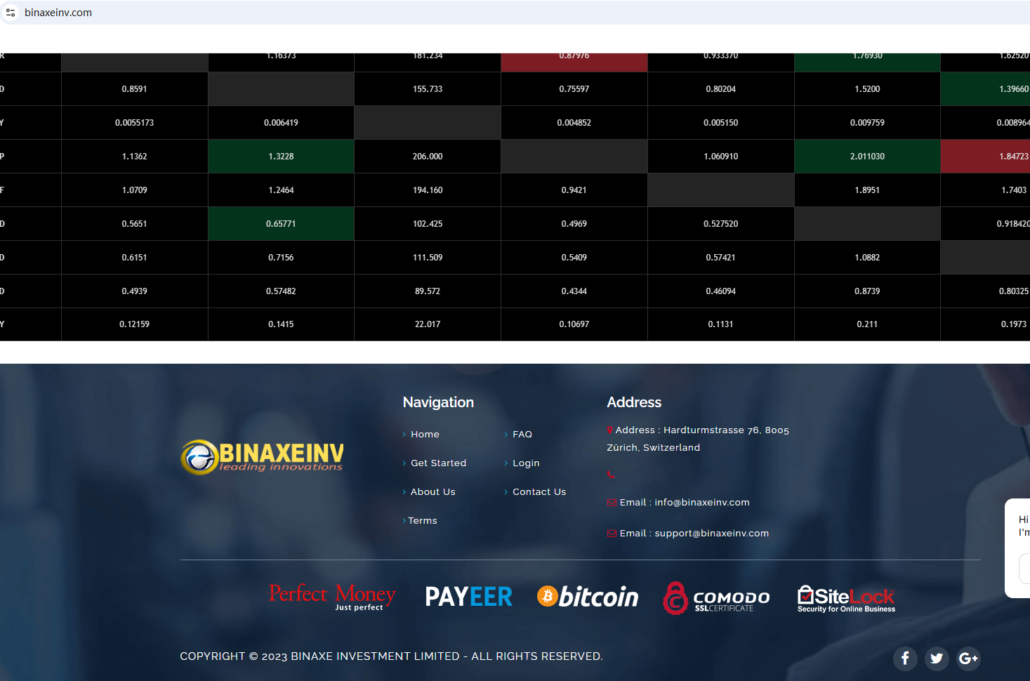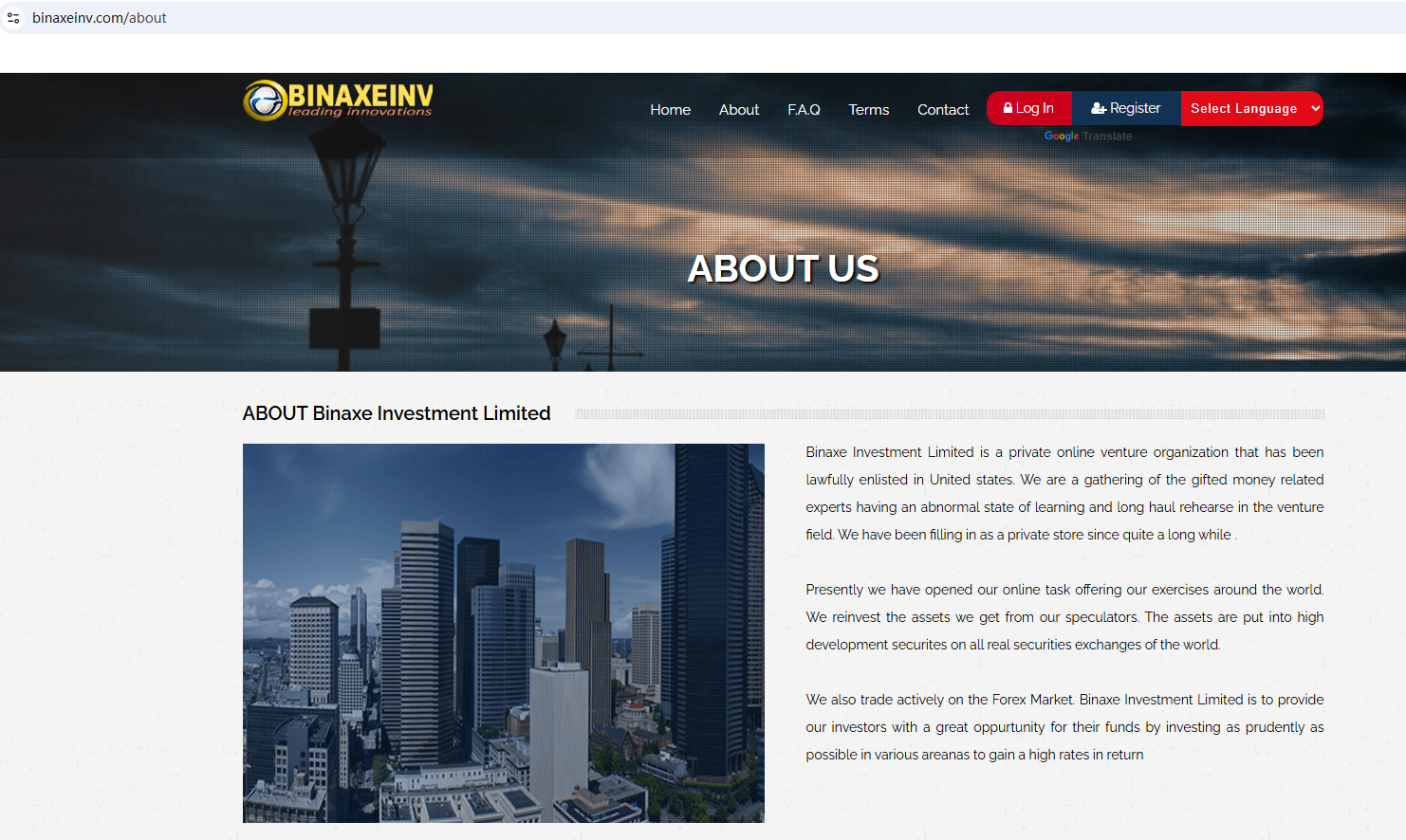 ตามข้อมูลบนเว็บไซต์ บริษัทอ้างว่าเป็นบริษัทที่จดทะเบียนในสหรัฐอเมริกา แต่ที่อยู่สำนักงานที่แสดงบนเว็บไซต์อยู่ในสวิตเซอร์แลนด์ การค้นหาไม่พบข้อมูลที่ตรงกับทั้งสมาคมฟิวเจอร์สแห่งชาติ (NFA) หรือหน่วยงานกำกับดูแลตลาดการเงินสวิส ( FINMA) นอกจากนี้ หน่วยงานกำกับดูแลตลาดการเงินนิวซีแลนด์ (NZ FMA) ยังได้เพิ่ม Binaxe Investment Limited เข้าไปในรายชื่อคำเตือน โดยระบุว่านี่เป็นแพลตฟอร์มการลงทุนปลอม