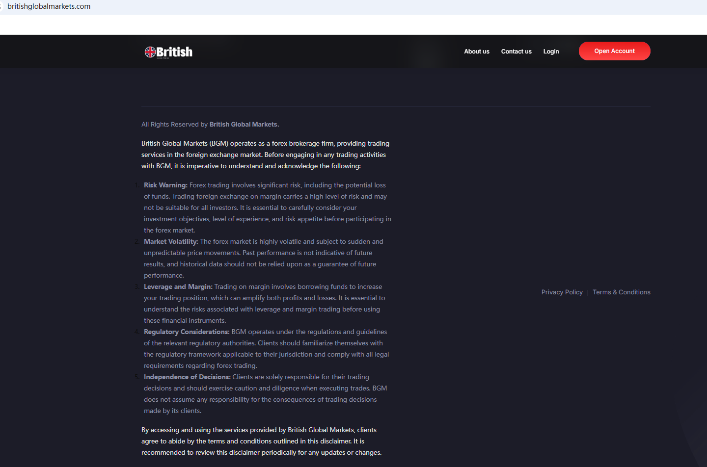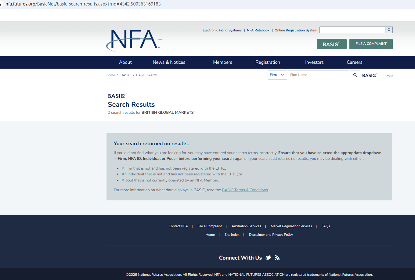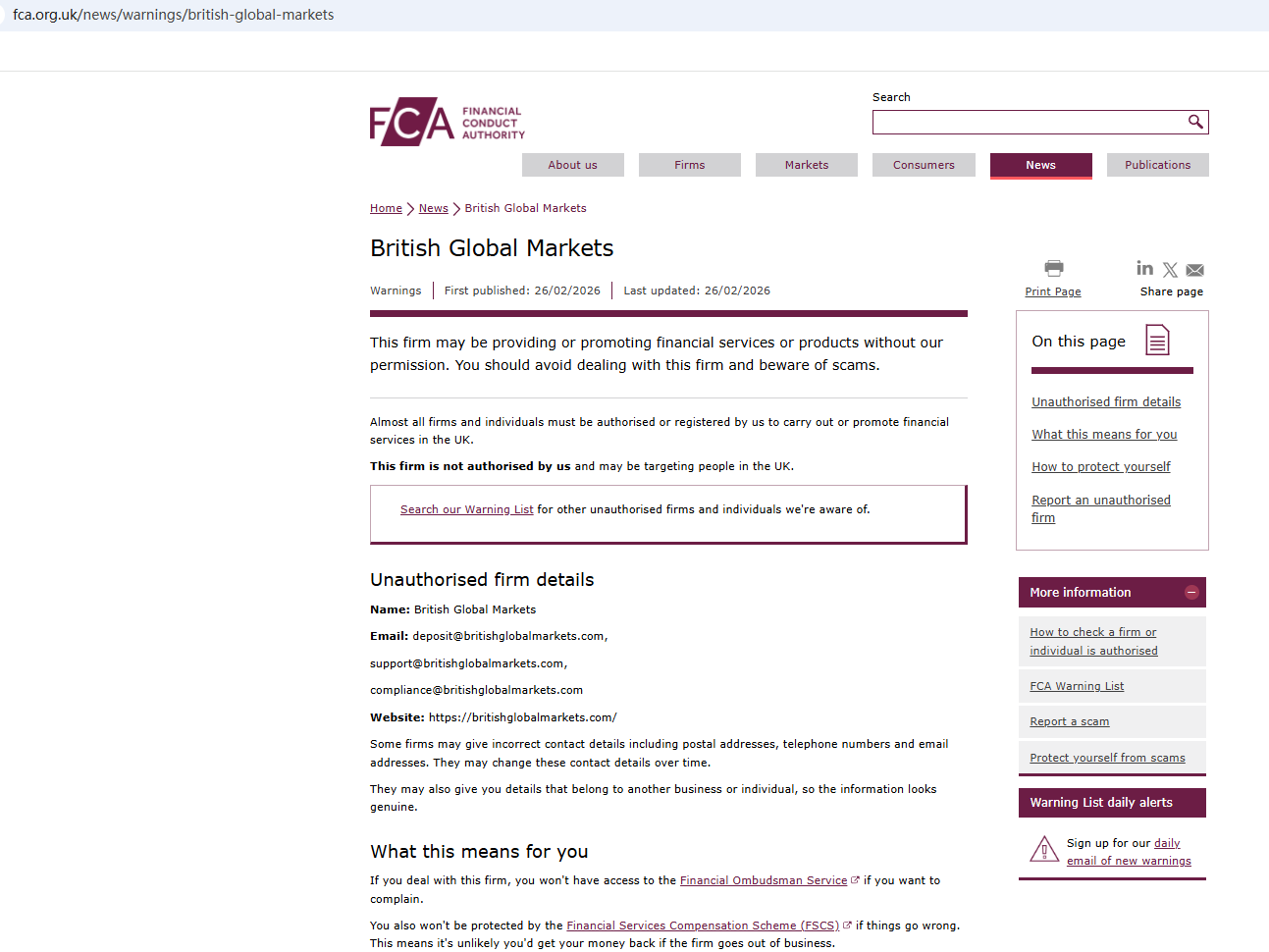 เมื่อวันที่ 26 กุมภาพันธ์ 2569 หน่วยงานกำกับดูแลด้านการเงิน (FCA) ได้ออกคำเตือนเกี่ยวกับบริษัท British Global Markets โดยสงสัยว่าบริษัทนี้อาจให้บริการหรือผลิตภัณฑ์ทางการเงินโดยไม่ได้รับอนุญาตอย่างถูกต้องhttps://www.fca.org.uk/news/warnings/british-global-markets