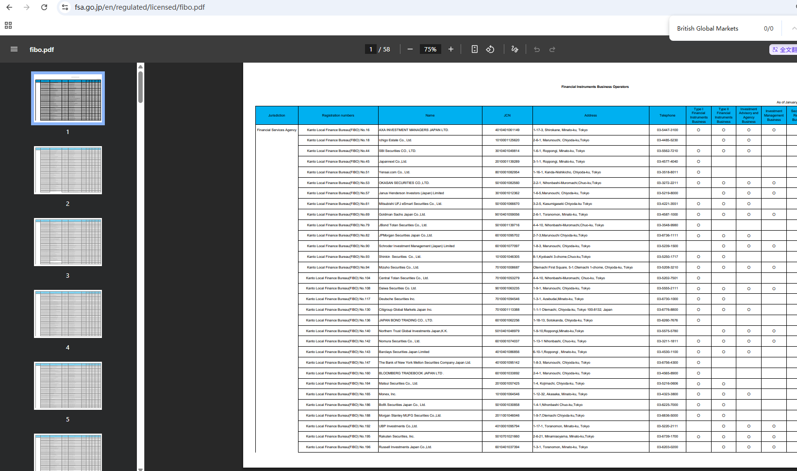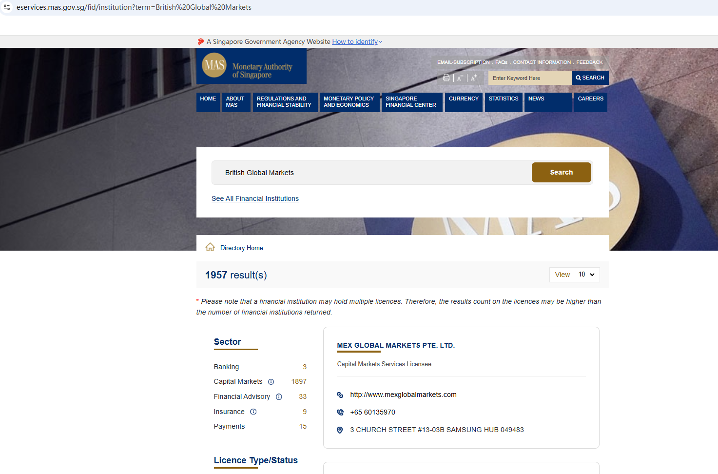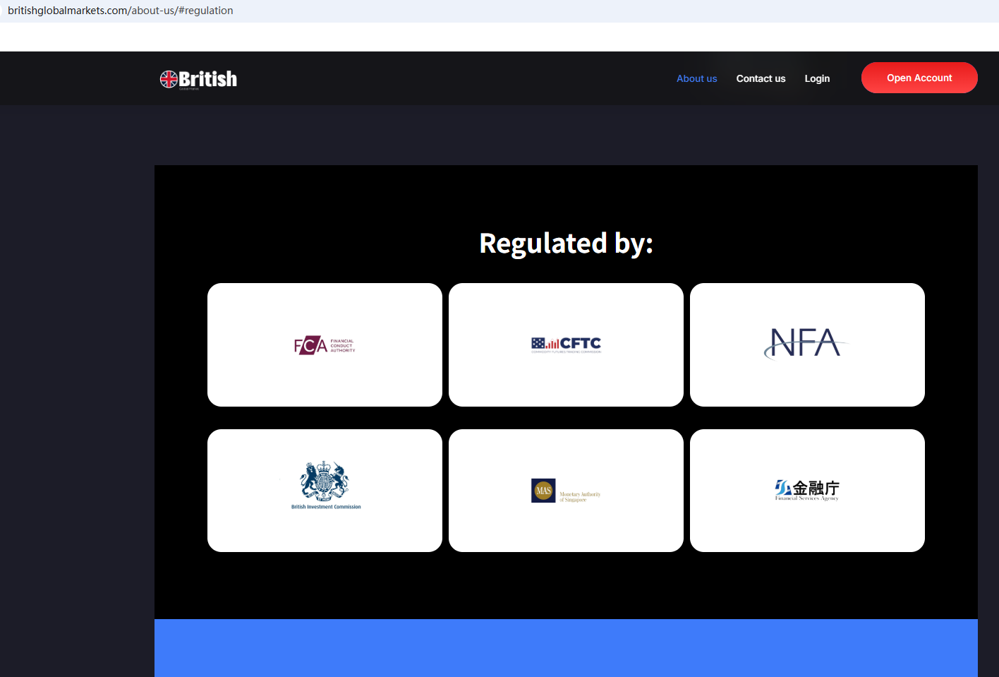 ตามข้อมูลบนเว็บไซต์ บริษัทอ้างว่าอยู่ภายใต้การกำกับดูแลของหน่วยงานกำกับดูแลหลายแห่ง อย่างไรก็ตาม การตรวจสอบไม่พบข้อมูลที่ตรงกันกับสมาคมฟิวเจอร์สแห่งชาติ (NFA) ธนาคารกลางสิงคโปร์ (MAS) หรือ สำนักงานบริการทางการเงินของญี่ปุ่น (FSA) นอกจากนี้ สำนักงานกำกับดูแลกิจการทางการเงิน (FCA) ยังได้ออกคำเตือนเกี่ยวกับ British Global Markets โดยสงสัยว่าบริษัทนี้อาจให้บริการหรือผลิตภัณฑ์ทางการเงินโดยไม่ได้รับอนุญาตที่จำเป็น