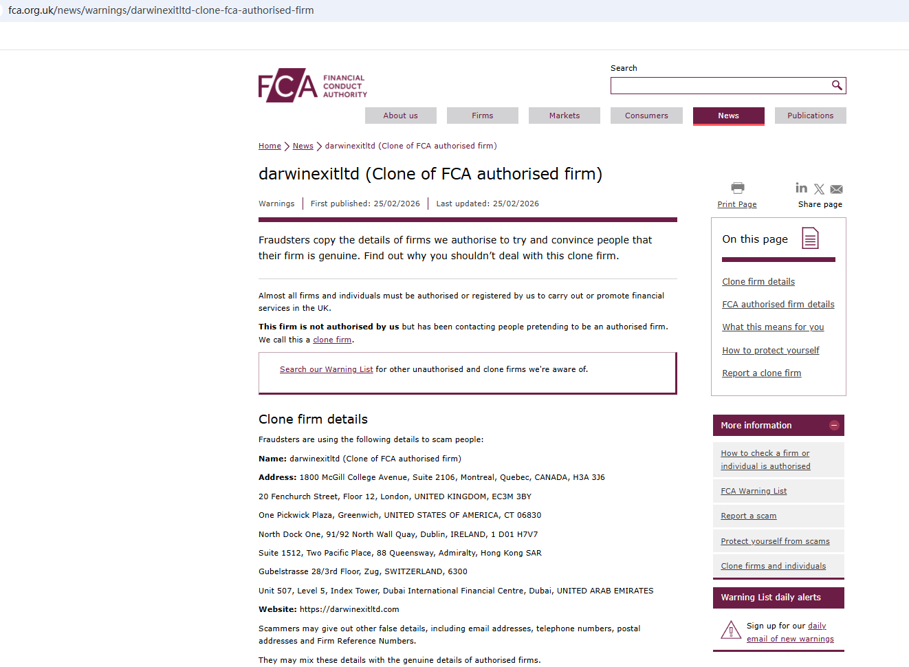 เมื่อวันที่ 25 กุมภาพันธ์ 2569 หน่วยงานกำกับดูแลทางการเงิน (FCA) ได้ตั้งข้อสังเกตเกี่ยวกับเว็บไซต์ darwinexitltd.com โดยระบุว่าเป็นบริษัทลอกเลียนแบบhttps://www.fca.org.uk/news/warnings/darwinexitltd-clone-fca-authorised-firm