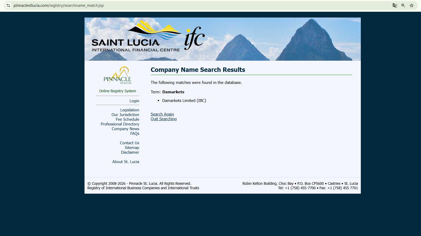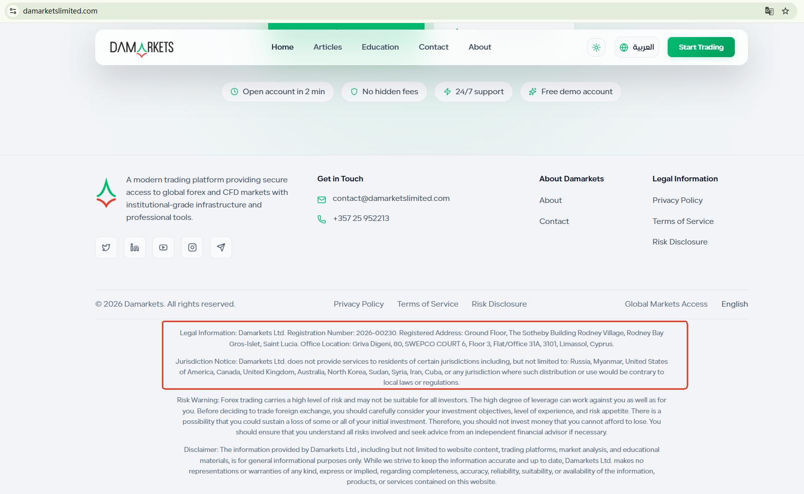 Damarkets does not assert that it is licensed by any financial authority. Instead, it only claims to be registered in Saint Lucia and to maintain an office in Cyprus. Although we were able to verify a company with the same name in the Saint Lucia International Financial Centre (IFC) registry, this registration merely confers International Business Company (IBC) status. This does not amount to a valid financial license, given that the IFC does not oversee or authorize forex trading activities.