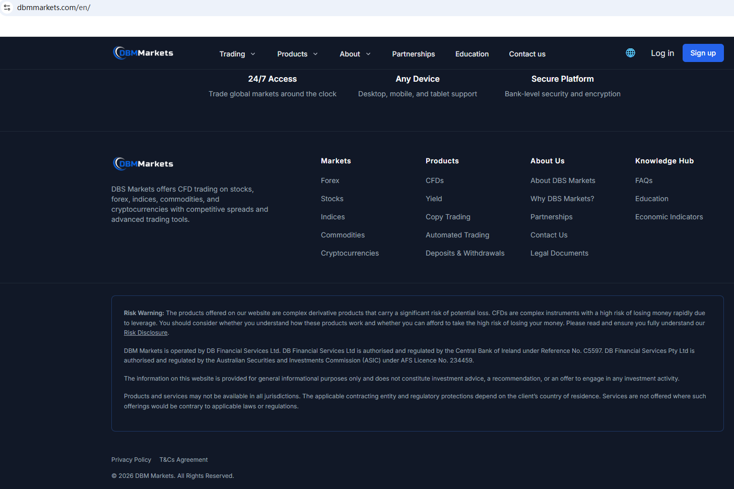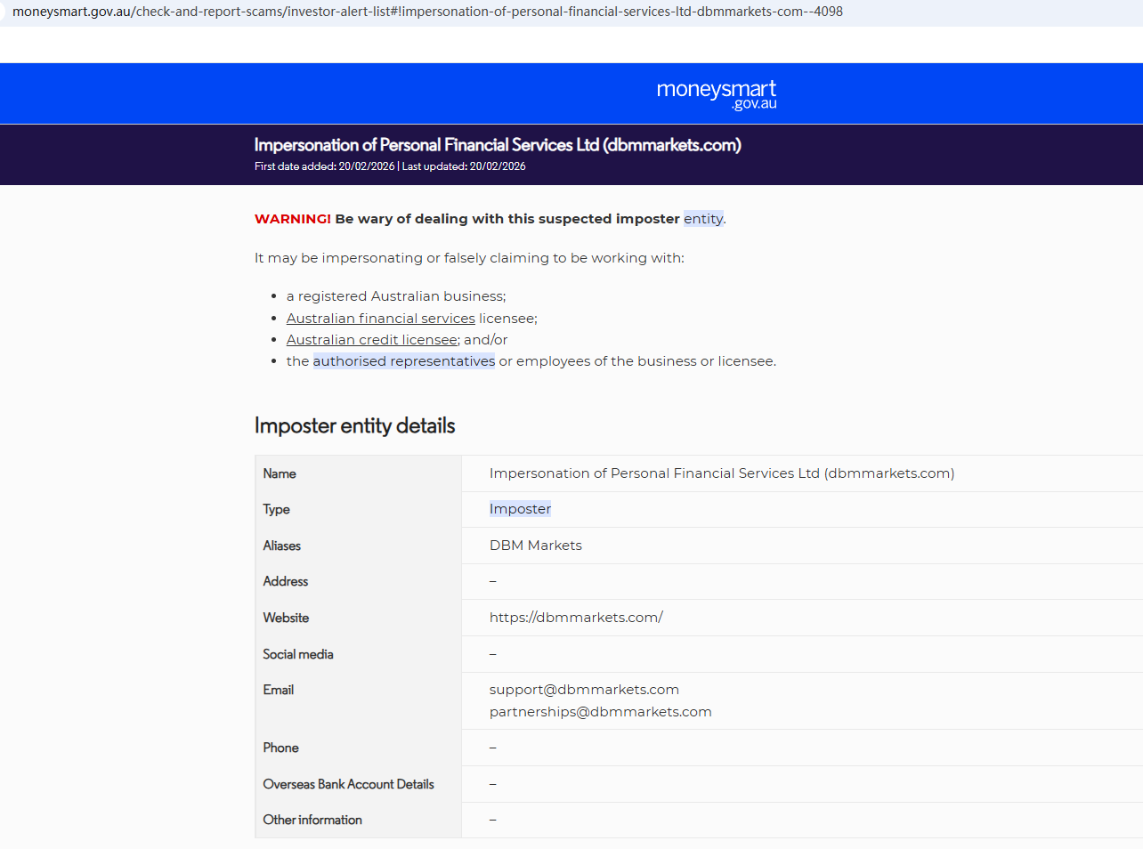 เมื่อวันที่ 20 กุมภาพันธ์ 2569 คณะกรรมการกำกับหลักทรัพย์และการลงทุนแห่งออสเตรเลีย (ASIC) ได้ออกคำเตือนเกี่ยวกับบริษัท DBM Markets โดยเชื่อว่าบริษัทนี้อาจให้บริการทางการเงินหรือผลิตภัณฑ์ทางการเงินโดยไม่ได้รับอนุญาตอย่างถูกต้องhttps://moneysmart.gov.au/check-and-report-scams/investor-alert-list#!impersonation-of-personal-financial-services-ltd-dbmmarkets-com--4098