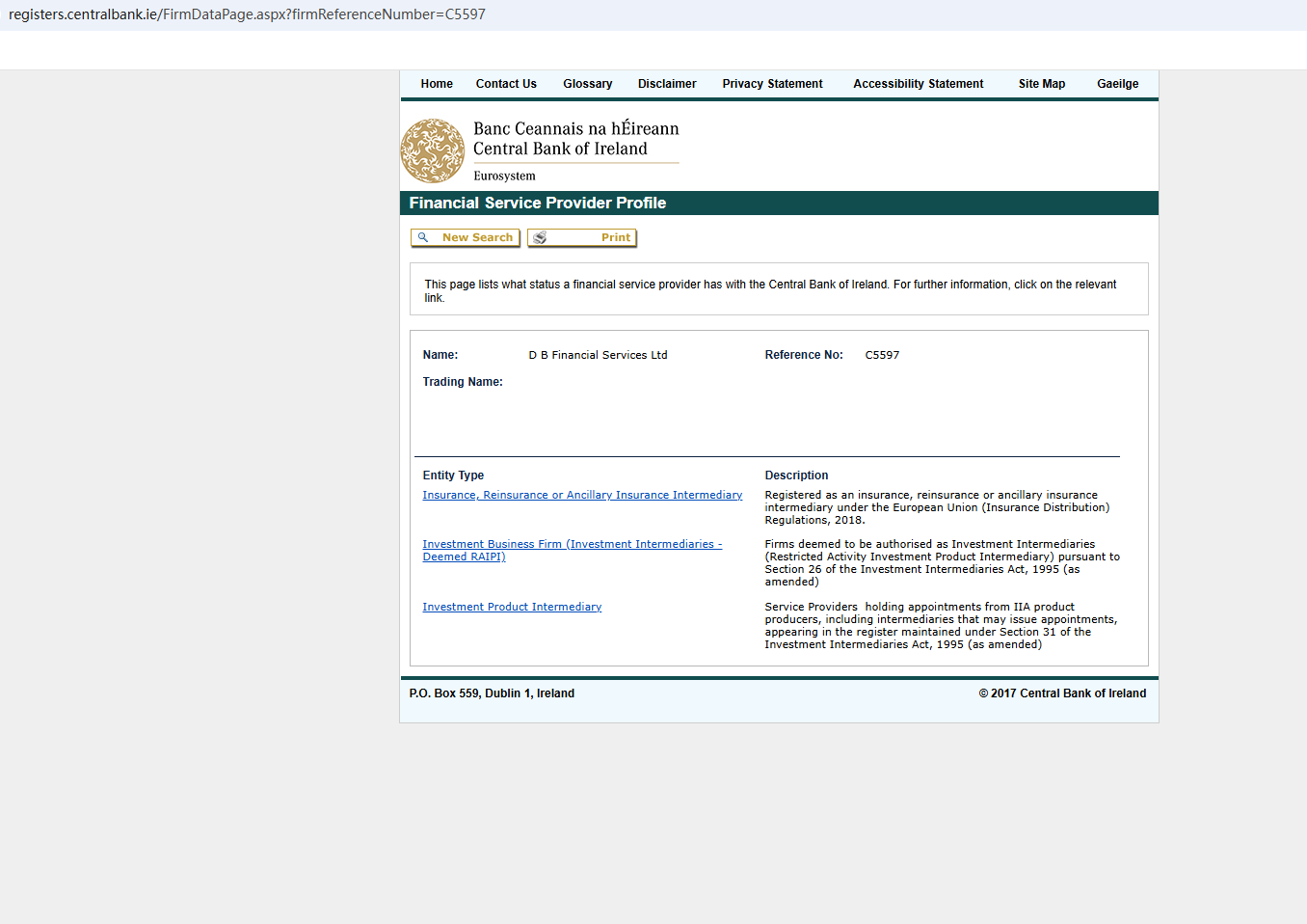 จากข้อมูลบนเว็บไซต์ บริษัทอ้างว่าได้รับการกำกับดูแลโดยธนาคารกลางแห่งไอร์แลนด์ ( CBI) และคณะกรรมการกำกับหลักทรัพย์และการลงทุนแห่งออสเตรเลีย ( ASIC) การตรวจสอบพบว่าบริษัทนี้อยู่ในฐานข้อมูลของ CBI อย่างไรก็ตาม ควรสังเกตว่าบริษัทที่ระบุไว้ในนั้นไม่มีชื่อโดเมนที่จดทะเบียน ดังนั้นความถูกต้องของข้อกล่าวอ้างของ DBM Markets บนเว็บไซต์จึงไม่สามารถยืนยันได้ นอกจากนี้ ASIC ยังได้ออกคำเตือนเกี่ยวกับ DBM Markets โดยเชื่อว่าบริษัทนี้อาจให้บริการทางการเงินหรือผลิตภัณฑ์โดยไม่ได้รับอนุญาตอย่างถูกต้อง