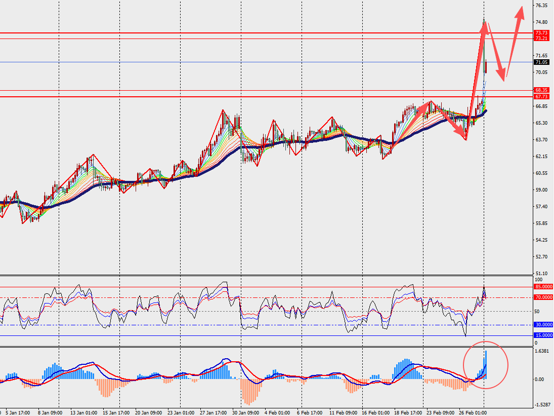 技术面:原油H4级别上涨回落,但依旧在48日多空分界线上方运行。此外,MACD双线和量能柱在零轴附近扩张。如果冲突持续,全球将面临中东石油流动的重大中断,除非美国能削弱伊朗的海军和军事力量,确保霍尔木兹海峡畅通。