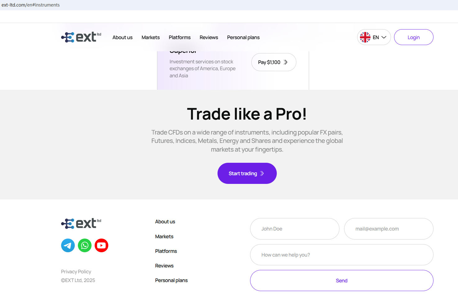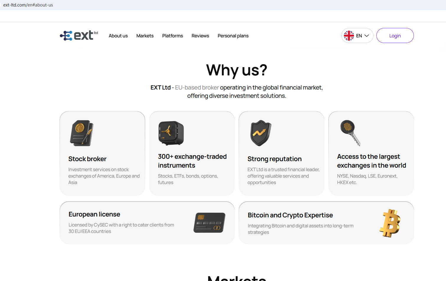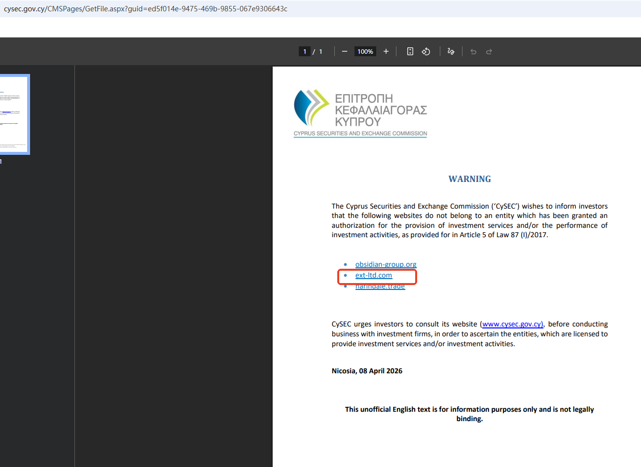 จากข้อมูลในเว็บไซต์ บริษัทตั้งอยู่ในประเทศไซปรัส จากการตรวจสอบ เราพบว่าสำนักงานคณะกรรมการกำกับหลักทรัพย์และตลาดหลักทรัพย์แห่งไซปรัส (CySEC) ได้ออกคำเตือนต่อบริษัท EXT Ltd โดยเชื่อว่าบริษัทนี้อาจให้บริการทางการเงินหรือผลิตภัณฑ์ทางการเงินโดยไม่ได้รับอนุญาต