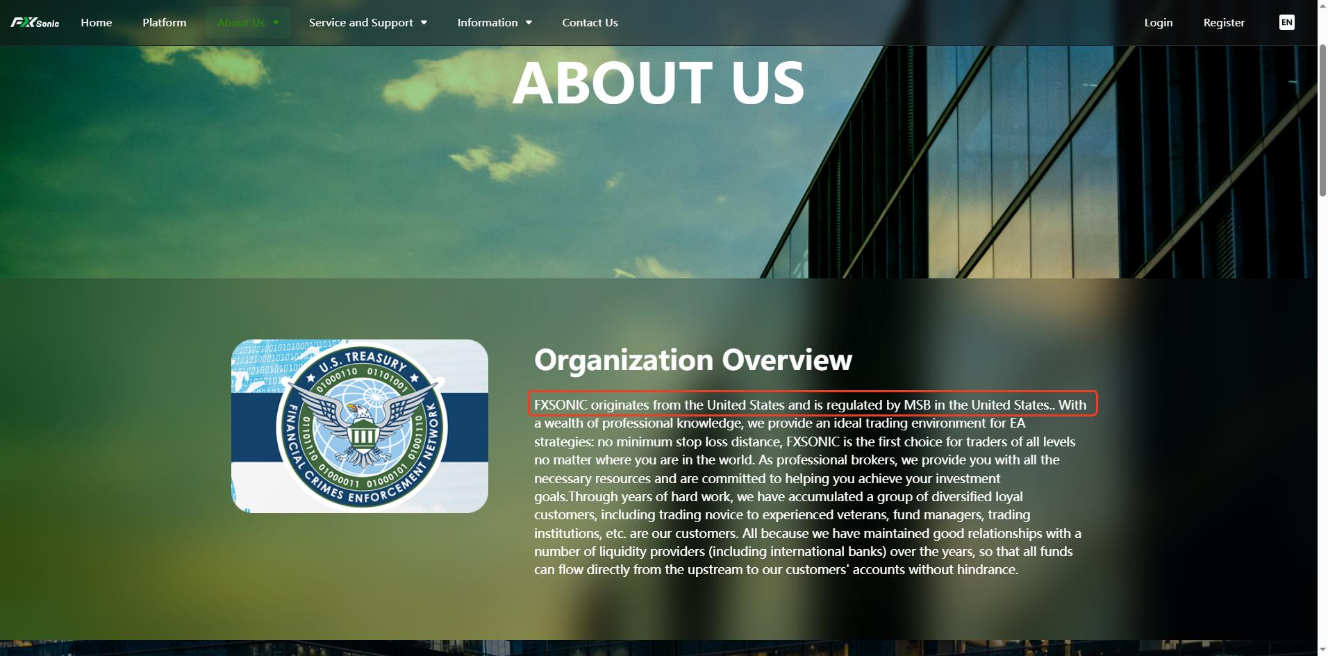 FXSonic อ้างว่าได้รับการกำกับดูแลโดยเครือข่ายบังคับใช้กฎหมายด้านอาชญากรรมทางการเงิน (FinCEN) แม้ว่าจะมีบันทึกการลงทะเบียนหมายเลข MSB นี้อยู่ในฐานข้อมูล แต่สิ่งสำคัญที่ควรทราบคือ FinCEN ไม่ได้กำกับดูแลกิจกรรมการซื้อขายแลกเปลี่ยนเงินตราต่างประเทศ (forex) ในสหรัฐอเมริกา หน่วยงานกำกับดูแลหลักที่ดูแลโบรกเกอร์ forex คือ สมาคมฟิวเจอร์สแห่งชาติ (NFA)อย่างไรก็ตาม จากการตรวจสอบพบว่า FXSonic ไม่ได้จดทะเบียนหรือได้รับอนุญาตจาก NFA หรือหน่วยงานกำกับดูแลทางการเงินที่มีชื่อเสียงอื่นใด ดังนั้น จากข้อมูลที่มีอยู่ FXSonic จึงดำเนินการโดยไม่ได้รับอนุญาตอย่างถูกต้องจากหน่วยงานกำกับดูแลตลาดแลกเปลี่ยนเงินตราต่างประเทศที่น่าเชื่อถือใดๆ ดังนั้น FXSonic จึงดูเหมือนจะเป็นการหลอกลวง
