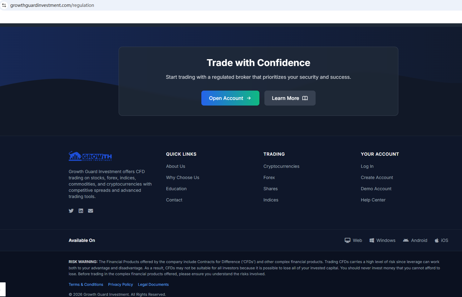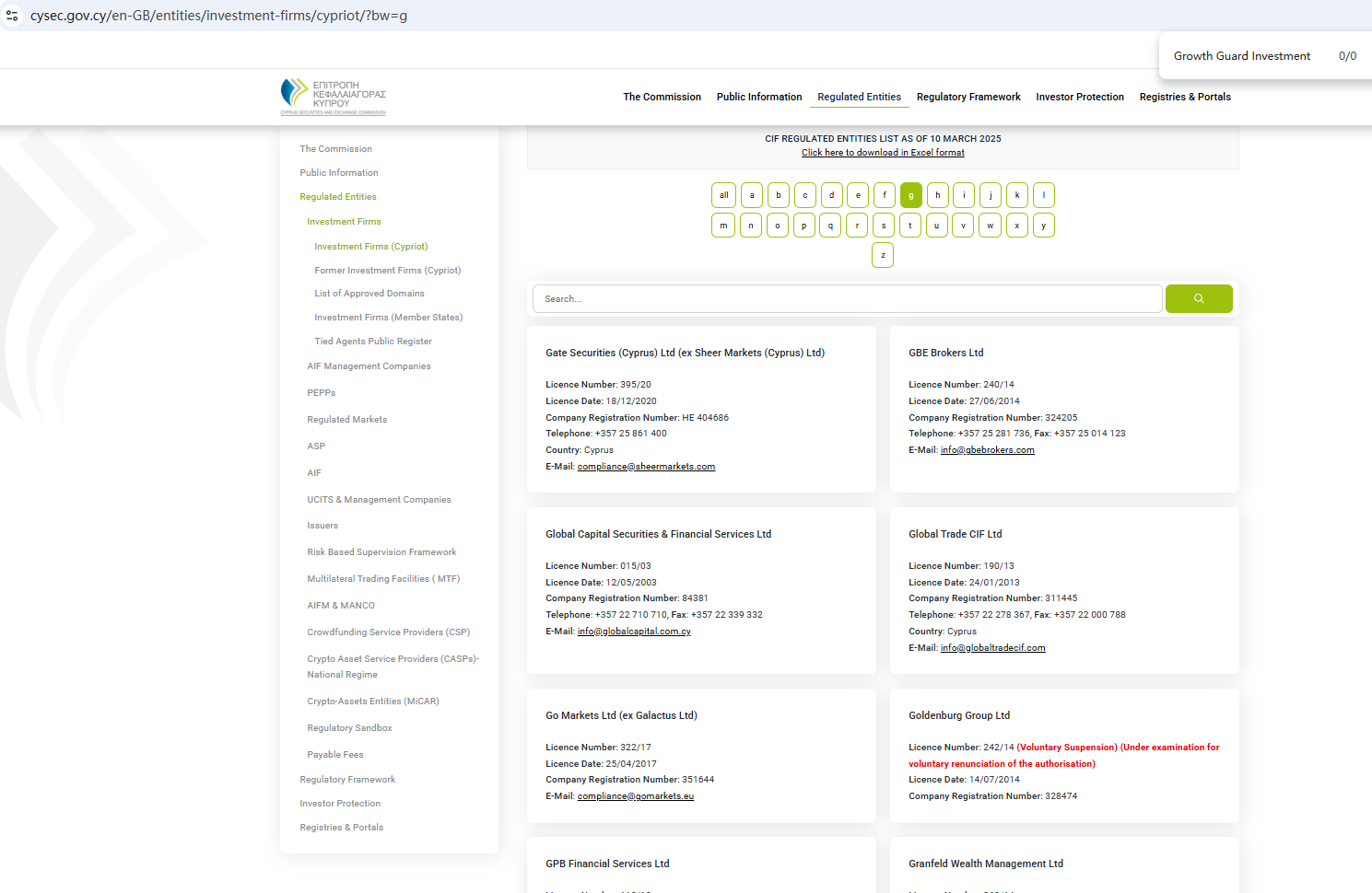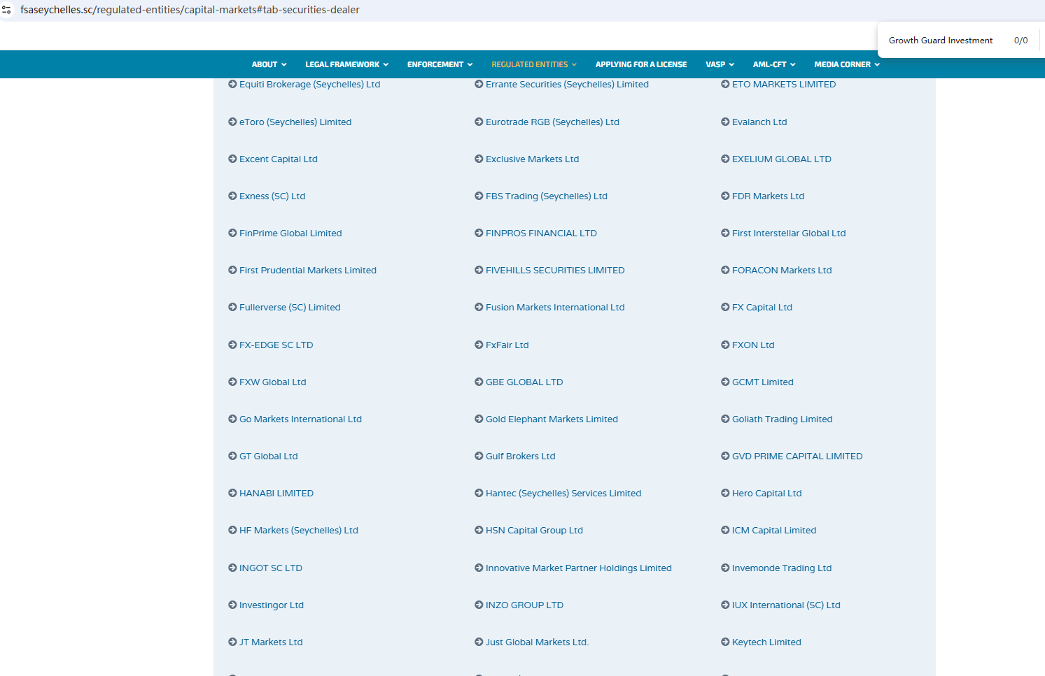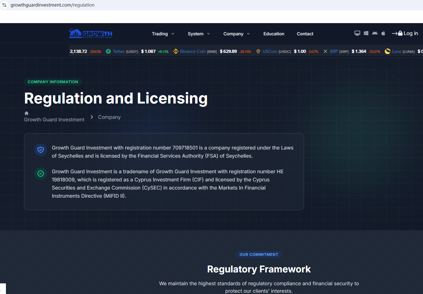 ตามข้อมูลบนเว็บไซต์ บริษัทอ้างว่าได้รับการกำกับดูแลโดยหน่วยงานกำกับดูแลบริการทางการเงินของเซเชลส์ (Seychelles FSA) และคณะกรรมการกำกับหลักทรัพย์และตลาดหลักทรัพย์ของไซปรัส (CySEC) อย่างไรก็ตาม จากการตรวจสอบไม่พบข้อมูลที่ตรงกันใน Seychelles FSA และ CySEC นอกจากนี้ หน่วยงานกำกับดูแลด้านการเงิน (FCA) ยังได้ออกคำเตือนเกี่ยวกับ Growth Guard Investment โดยสงสัยว่าบริษัทนี้อาจให้บริการหรือผลิตภัณฑ์ทางการเงินโดยไม่ได้รับอนุญาตอย่างถูกต้อง