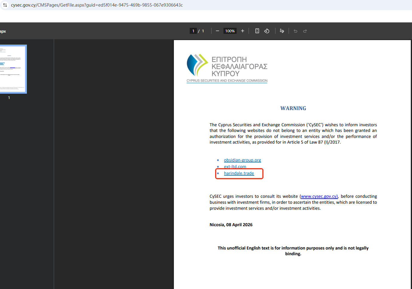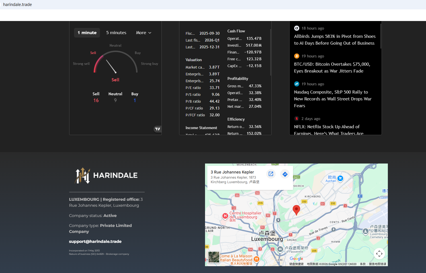 ตามข้อมูลบนเว็บไซต์ บริษัทนี้จดทะเบียนในประเทศลักเซมเบิร์ก อย่างไรก็ตาม การตรวจสอบไม่พบข้อมูลที่ตรงกันใน เว็บไซต์ของ คณะกรรมการกำกับดูแลภาคการเงิน ( CSSF) นอกจากนี้ คณะกรรมการกำกับหลักทรัพย์และตลาดหลักทรัพย์ไซปรัส (CySEC) ยังได้ออกคำเตือนเกี่ยวกับบริษัท Harindale โดยเชื่อว่าบริษัทนี้อาจให้บริการหรือผลิตภัณฑ์ทางการเงินโดยไม่ได้รับอนุญาต