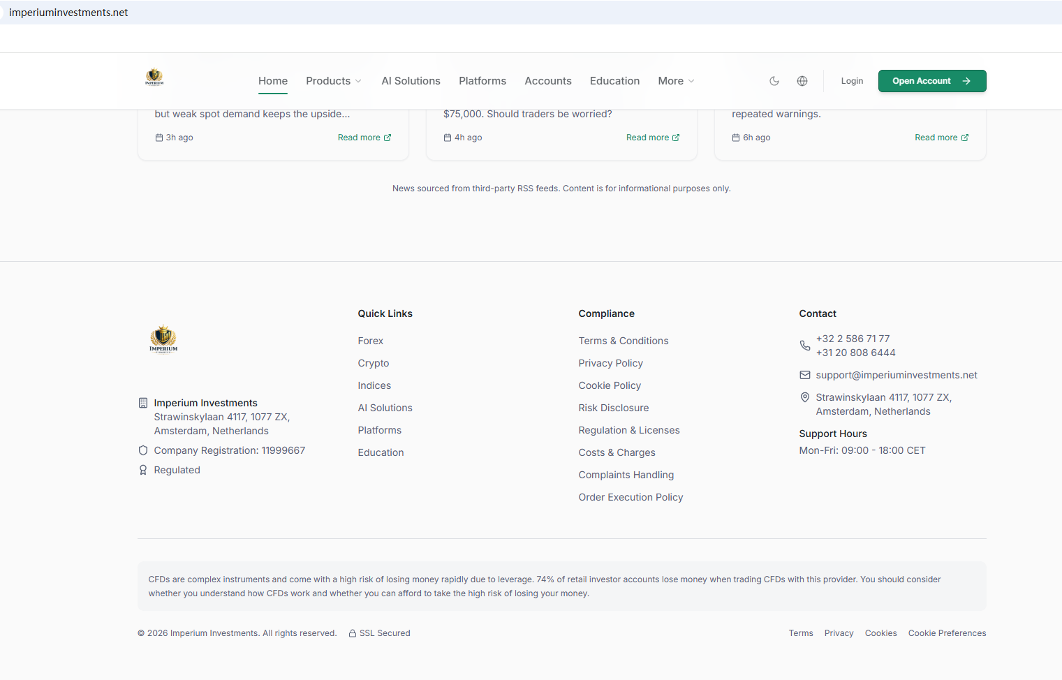 จากข้อมูลในเว็บไซต์ บริษัทอ้างว่าสำนักงานตั้งอยู่ในประเทศเนเธอร์แลนด์และอยู่ภายใต้การกำกับดูแล จากการตรวจสอบ เราพบว่าหน่วยงานกำกับดูแลตลาดการเงิน (Autoriteit Financiële Markten หรือ AFM) ได้ออกคำเตือนเกี่ยวกับบริษัท Imperium Investments โดยสงสัยว่าบริษัทนี้อาจให้บริการหรือผลิตภัณฑ์ทางการเงินโดยไม่ได้รับอนุญาตอย่างถูกต้อง