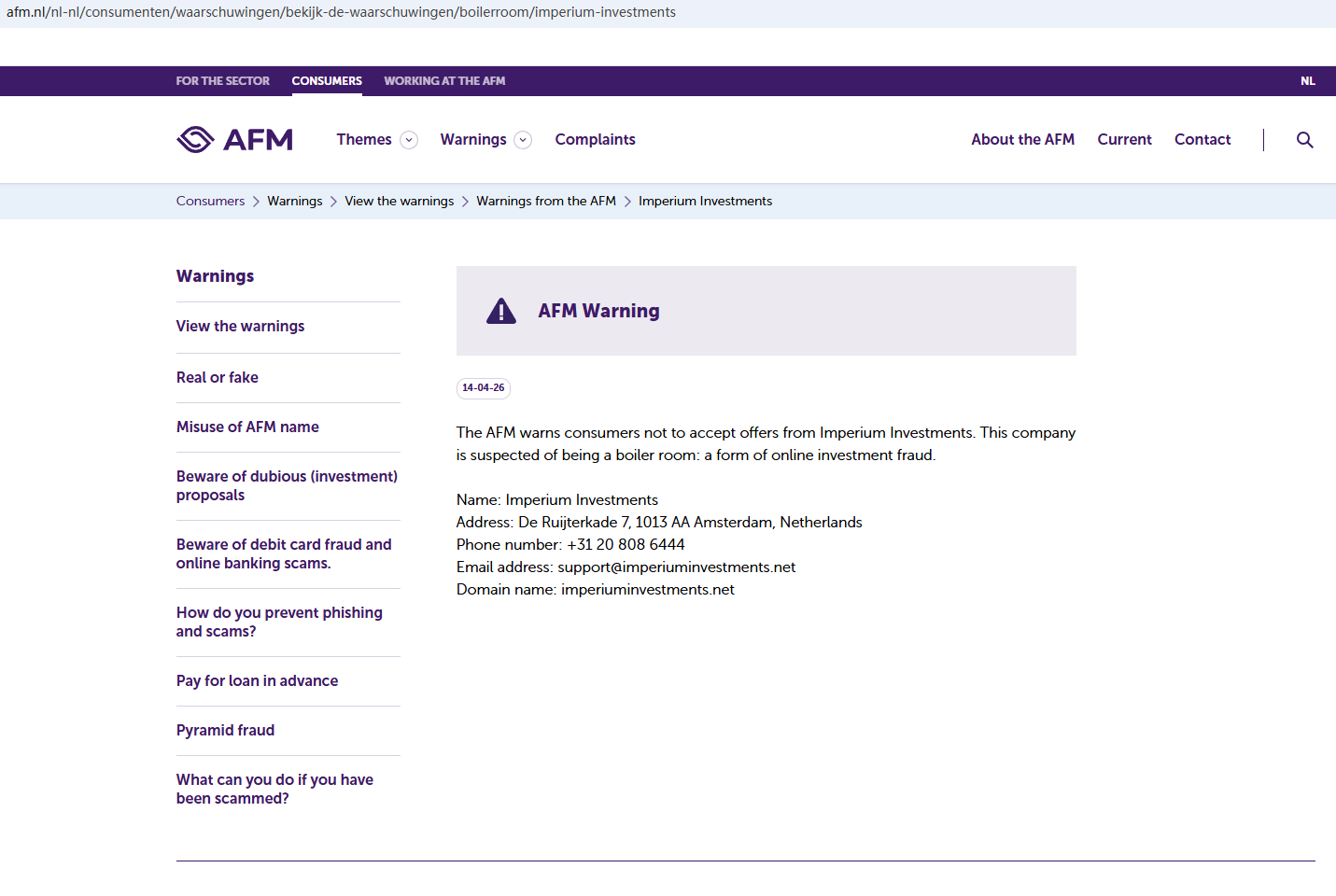 เมื่อวันที่ 14 เมษายน 2569 หน่วยงานกำกับดูแลตลาดการเงินแห่งชาติ (AFM) ได้ออกคำเตือนเกี่ยวกับบริษัท Imperium Investments โดยสงสัยว่าบริษัทนี้อาจให้บริการหรือผลิตภัณฑ์ทางการเงินโดยไม่ได้รับอนุญาตอย่างถูกต้องhttps://www.afm.nl/nl-nl/consumenten/waarschuwingen/bekijk-de-waarschuwingen/boilerroom/imperium-investments
