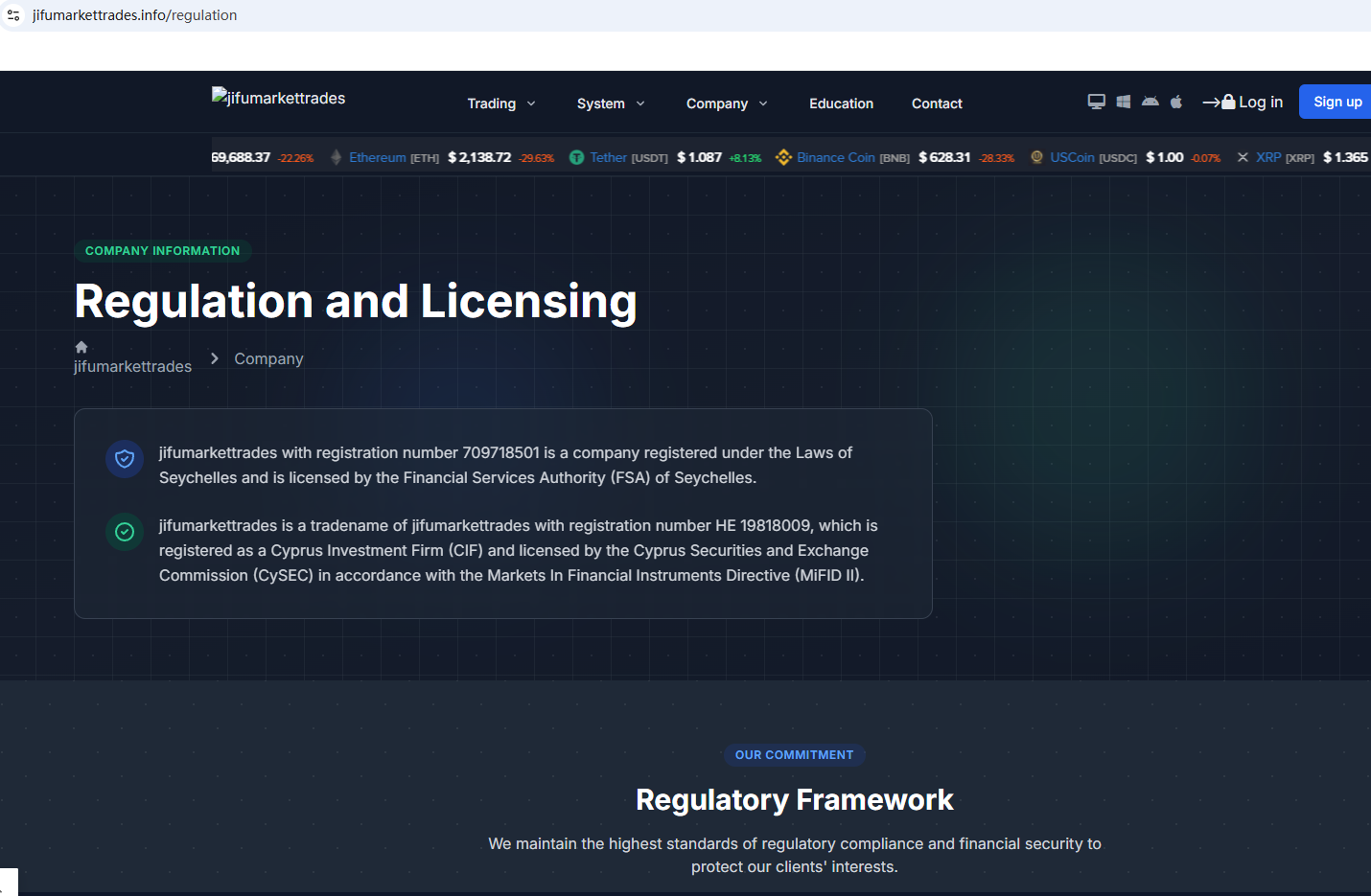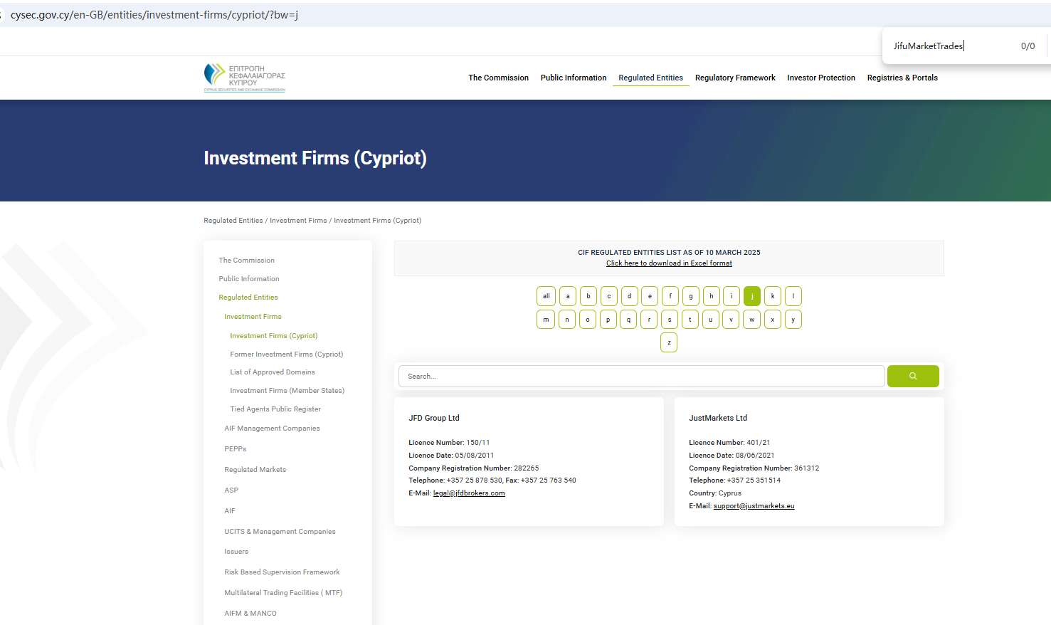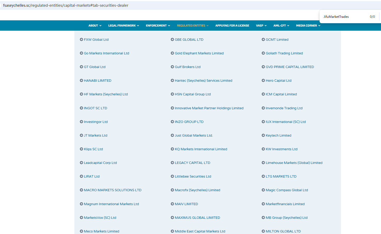 ตามข้อมูลบนเว็บไซต์ บริษัทอ้างว่าได้รับการกำกับดูแลโดยหน่วยงานกำกับดูแลบริการทางการเงินของเซเชลส์ (Seychelles FSA) และคณะกรรมการกำกับหลักทรัพย์และตลาดหลักทรัพย์ของไซปรัส (CySEC) อย่างไรก็ตาม จากการตรวจสอบไม่พบข้อมูลที่ตรงกันใน Seychelles FSA และ CySEC นอกจากนี้ หน่วยงานกำกับดูแลทางการเงิน (FCA) ยังได้ออกคำเตือนเกี่ยวกับ JifuMarketTrades โดยสงสัยว่าบริษัทนี้อาจให้บริการหรือผลิตภัณฑ์ทางการเงินโดยไม่ได้รับอนุญาตอย่างถูกต้อง