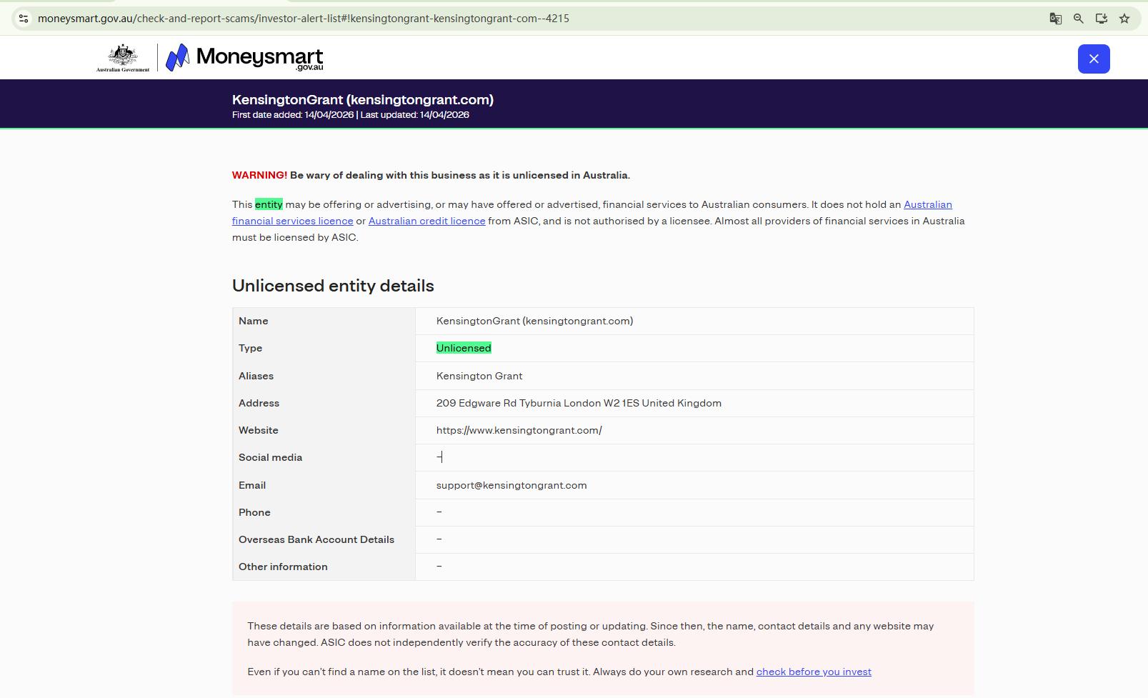 เมื่อวันที่ 14 เมษายน 2569 คณะกรรมการกำกับหลักทรัพย์และการลงทุนแห่งออสเตรเลีย (ASIC) ได้ออกคำเตือนเกี่ยวกับบริษัท KensingtonGrant โดยเชื่อว่าบริษัทนี้อาจให้บริการทางการเงินหรือผลิตภัณฑ์โดยไม่ได้รับอนุญาตอย่างถูกต้องในออสเตรเลียhttps://moneysmart.gov.au/check-and-report-scams/investor-alert-list#!kensingtongrant-kensingtongrant-com--4215