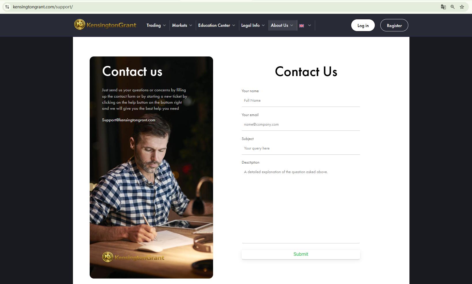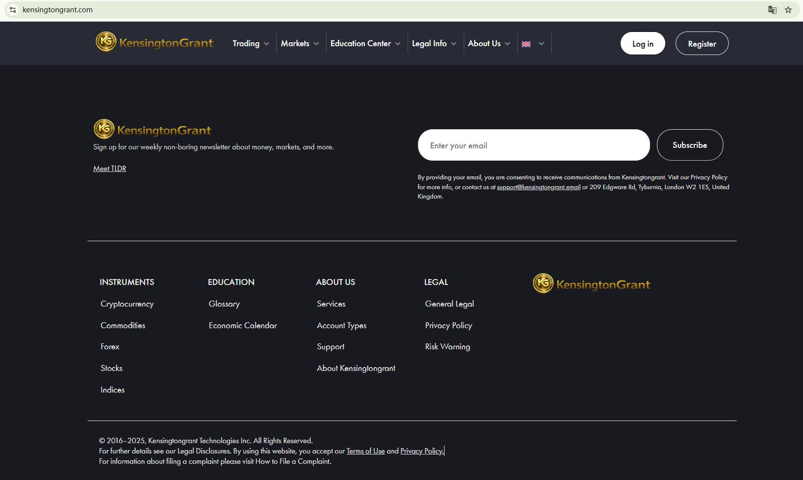 เว็บไซต์ของ KensingtonGrant ไม่เปิดเผยข้อมูลด้านกฎระเบียบใดๆ และไม่แสดงข้อมูลพื้นฐานของบริษัท เช่น ชื่อนิติบุคคล ที่อยู่จดทะเบียน เขตอำนาจศาลที่จดทะเบียน หรือรายละเอียดการติดต่อ การขาดความโปร่งใสนี้ทำให้ไม่สามารถตรวจสอบได้ว่าแพลตฟอร์มดังกล่าวมีใบอนุญาตที่ถูกต้องหรือไม่ หรือดำเนินการภายใต้การกำกับดูแลที่ถูกต้องตามกฎหมายหรือไม่