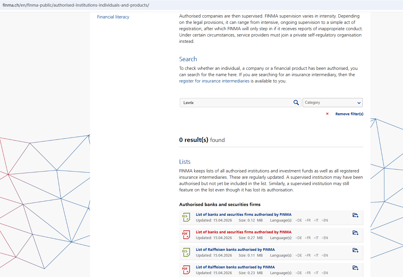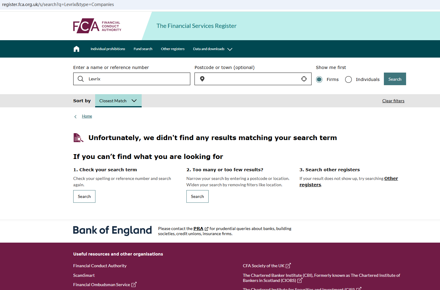 ในความเป็นจริง Levrix ไม่ได้รับการกำกับดูแลจากหน่วยงานใดๆ ดังนั้น Levrix จึงเป็นการหลอกลวง