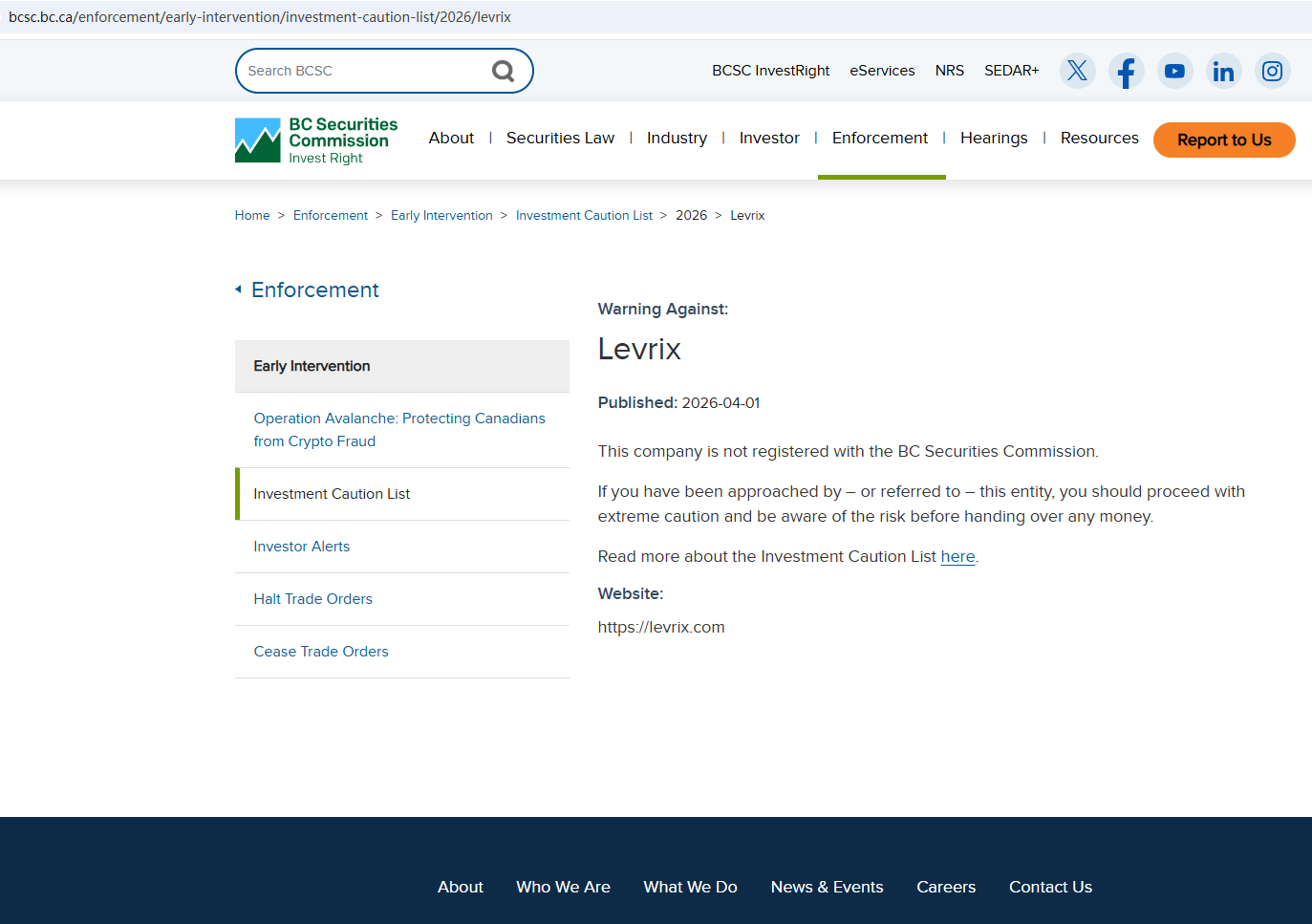 เมื่อวันที่ 1 เมษายน 2569 คณะกรรมการกำกับหลักทรัพย์แห่งรัฐบริติชโคลัมเบีย (BCSC) ได้ออกคำเตือนเกี่ยวกับ Clone Levrix โดยระบุว่าโบรกเกอร์รายนี้ไม่ได้จดทะเบียนเพื่อทำการซื้อขายหรือให้คำแนะนำเกี่ยวกับหลักทรัพย์หรืออนุพันธ์ในรัฐบริติชโคลัมเบียhttps://www.bcsc.bc.ca/enforcement/early-intervention/investment-caution-list/2026/levrix