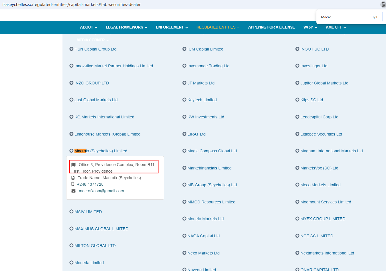 MACRO MARKETS อ้างว่าตั้งอยู่ในฮ่องกงและอยู่ภายใต้การกำกับดูแลอย่างเต็มรูปแบบ แต่ไม่ได้ให้รายละเอียดเฉพาะเจาะจงเกี่ยวกับใบอนุญาตการกำกับดูแล ตามกฎหมายที่เกี่ยวข้อง โบรกเกอร์ฟอเร็กซ์ที่อยู่ภายใต้การกำกับดูแลทั้งหมดในฮ่องกงควรอยู่ภายใต้การตรวจสอบของสำนักงานคณะกรรมการกำกับหลักทรัพย์และสัญญาซื้อขายล่วงหน้าฮ่องกง (SFC) อย่างไรก็ตาม เราไม่พบผลลัพธ์ที่ตรงกันสำหรับโบรกเกอร์รายนี้ใน SFC ความจริงก็คือ MACRO MARKETS ไม่ได้อยู่ภายใต้การกำกับดูแลที่ถูกต้องตามกฎหมายจากหน่วยงานกำกับดูแลใดๆ ในการให้บริการด้านการลงทุน เงินทุนของนักลงทุนในบริษัทนี้ไม่ปลอดภัยและไม่สามารถได้รับการคุ้มครองตามกฎหมายใดๆ ได้ นี่เป็นการหลอกลวง