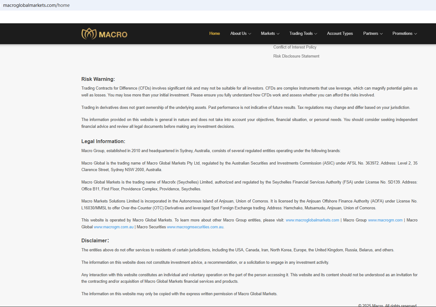 เว็บไซต์ของบริษัทอ้างว่าอยู่ภายใต้การกำกับดูแลของหน่วยงานกำกับดูแลหลายแห่ง เมื่อตรวจสอบแล้วพบว่าที่อยู่ของ Macro Group ไม่ตรงกับที่อยู่ของผู้ค้าทั้งหมดที่อยู่ในระบบ และไม่พบข้อมูลที่ตรงกันใน Anjouan Offshore Finance Authority (AOFA) ประการที่สอง บริษัทอ้างว่าก่อตั้งขึ้นในปี 2010 แต่หลังจากตรวจสอบแล้วพบว่าชื่อโดเมนของบริษัทก่อตั้งขึ้นในปี 2011 ซึ่งเป็นข้อมูลที่น่าเชื่อถือได้ยาก นักลงทุนควรระมัดระวังในการระบุและหลีกเลี่ยงชื่อโดเมนนี้